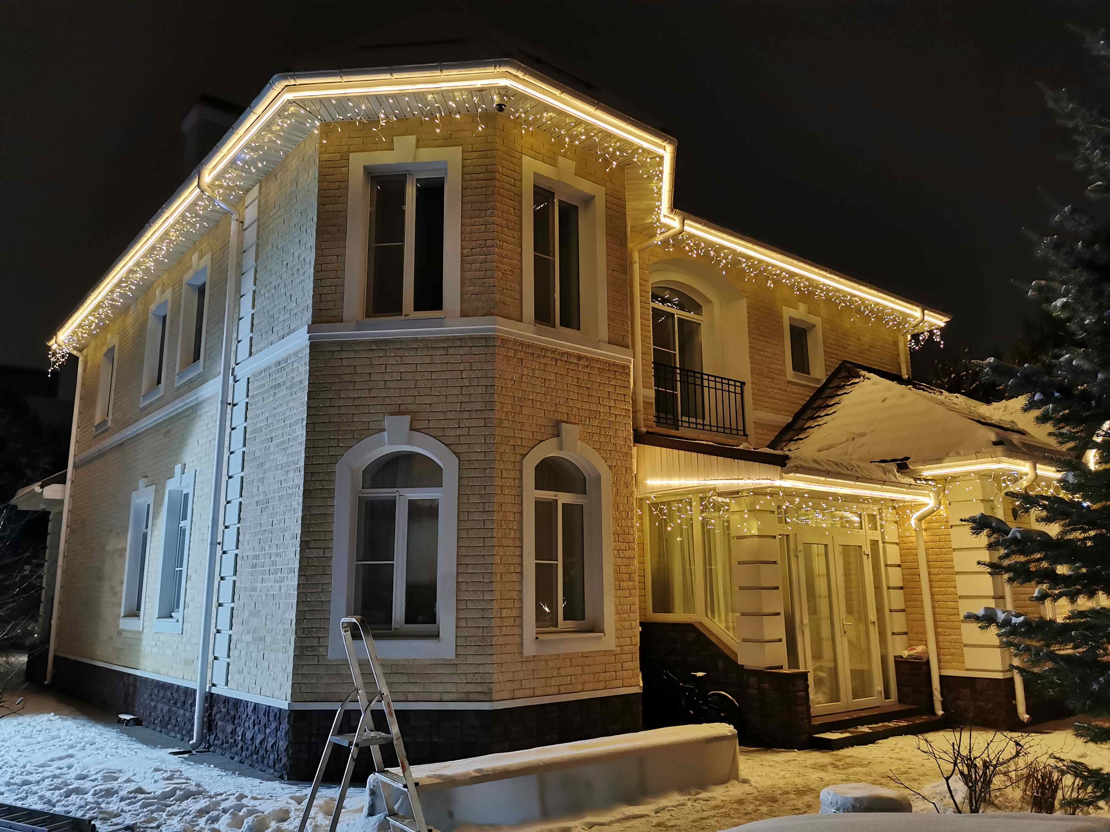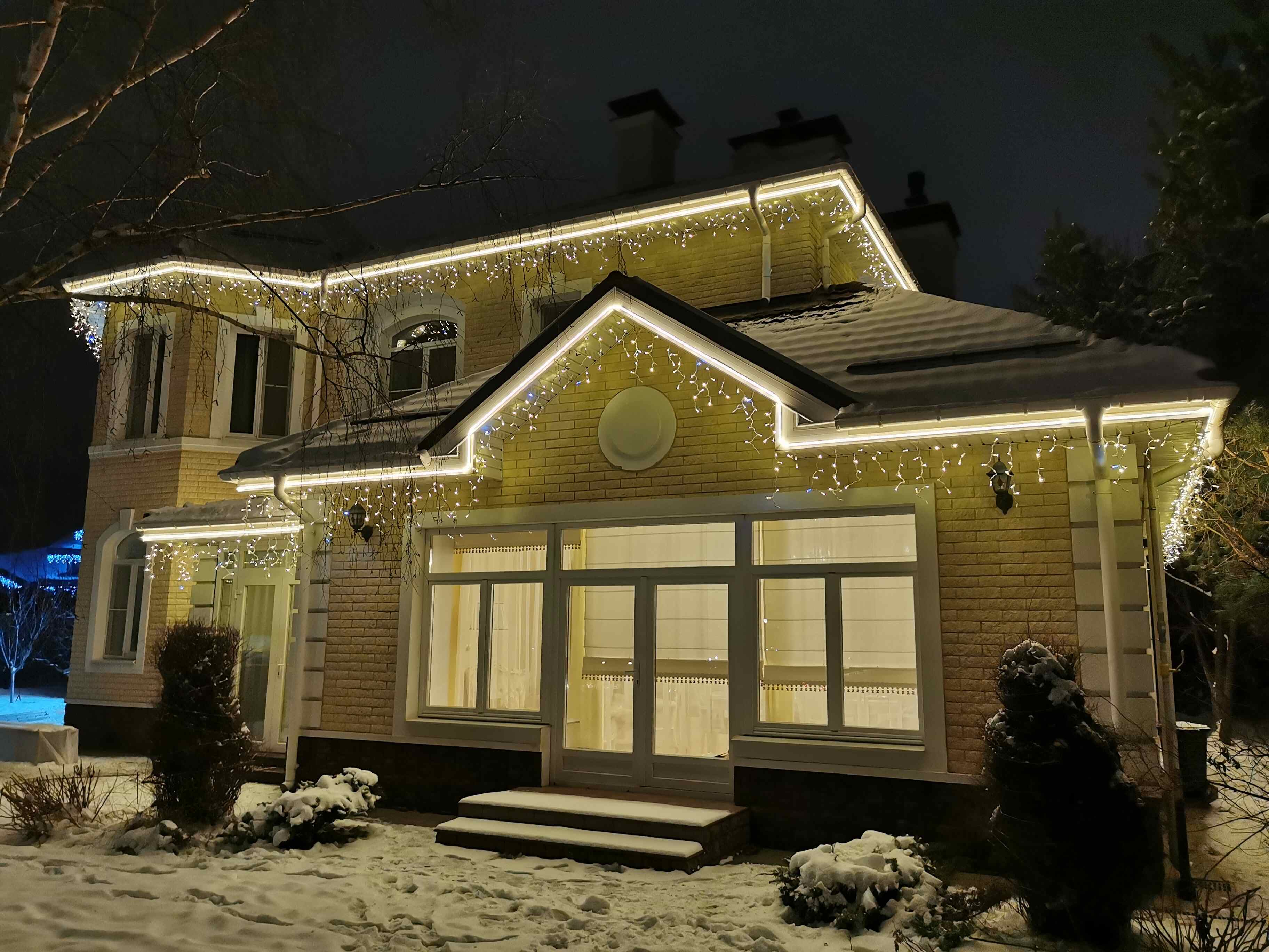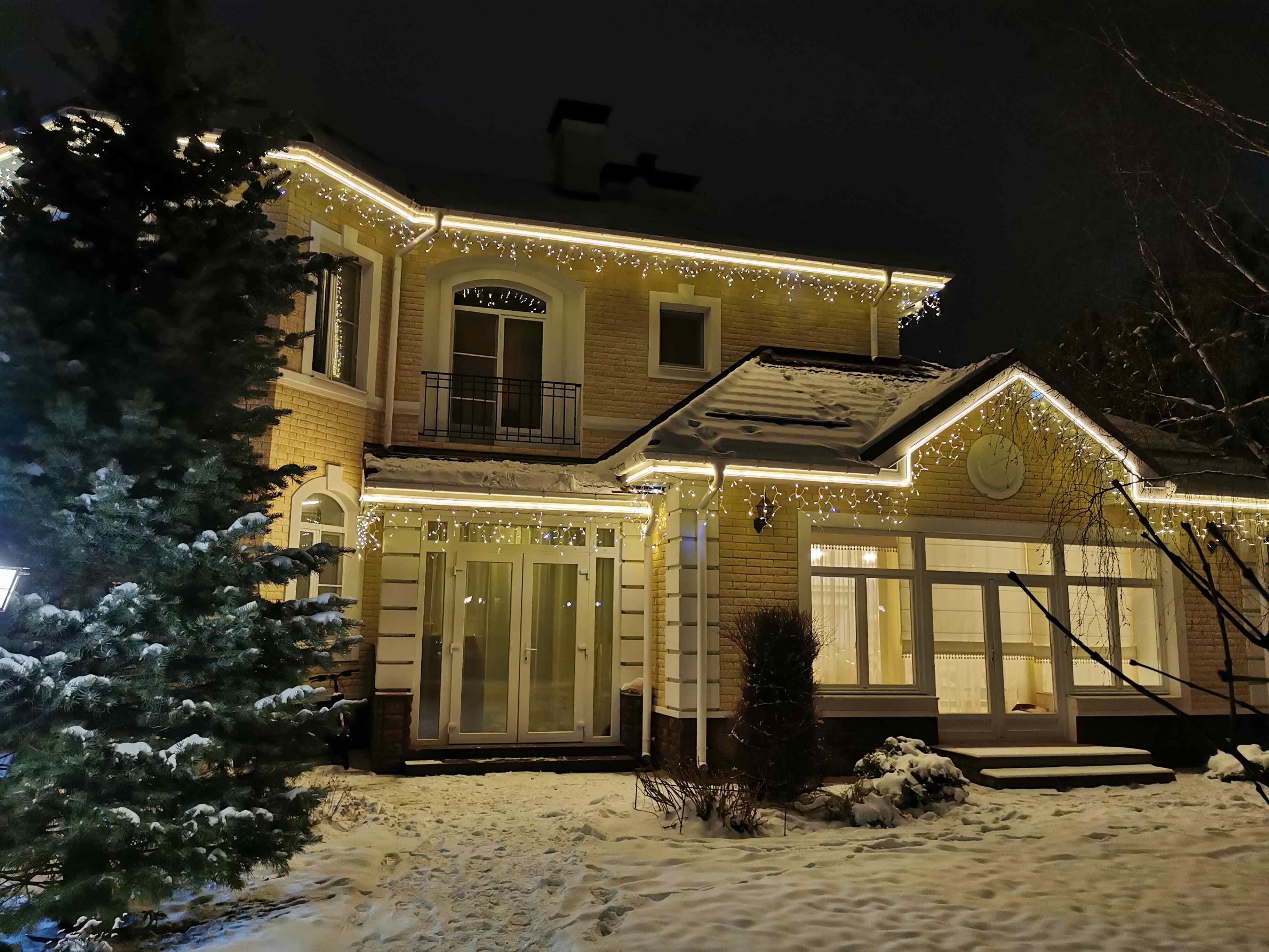 Сложность заключалась в конструкции дома с двумя контурами кровли — верхним и нижним. Их подключили к разным источникам питания и объединили через Wi-Fi-реле для централизованного управления. Подсветку установили с трёх сторон: фасад, правая и левая. Заднюю часть решили не подсвечивать, так как она редко используется. На правой стороне, где расположена детская, сделали мягкий свет без бликов в окна.