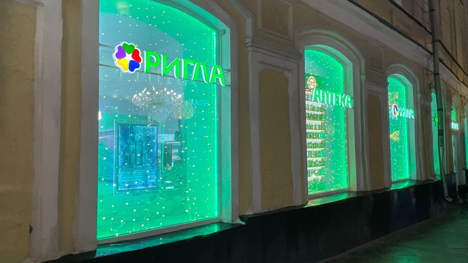 Витрины аптеки «Ригла» оформлены гирляндой-занавесом с зелёным свечением. Цвет выбран не случайно — он ассоциируется с медициной и сразу указывает на назначение объекта. Подсветка делает фасад заметным издалека и подчёркивает фирменный стиль бренда.