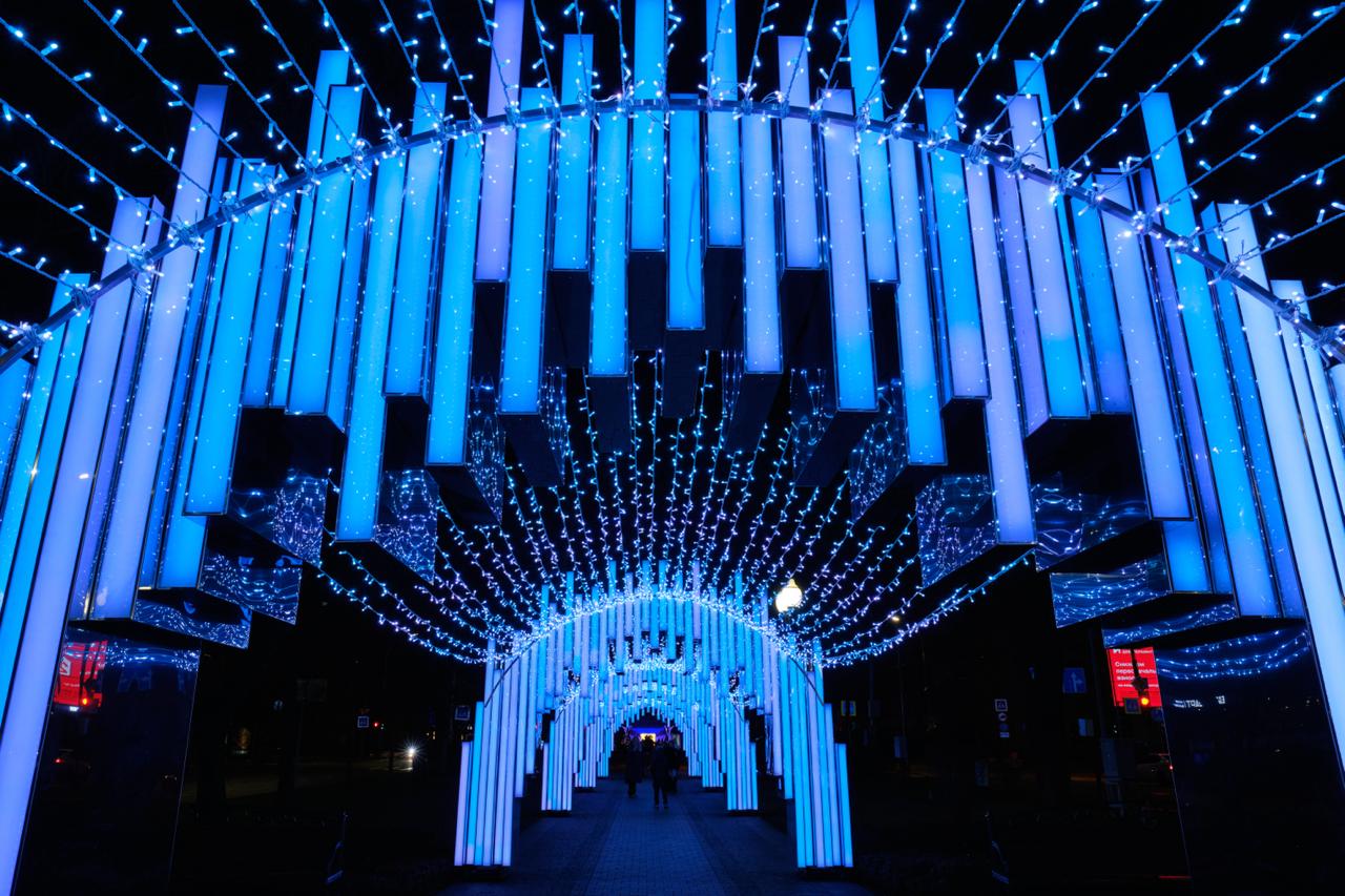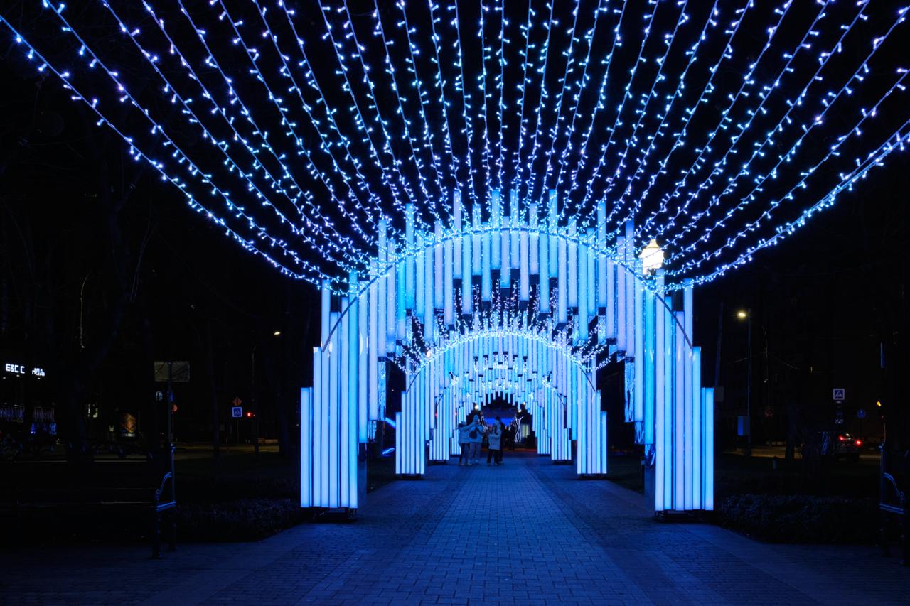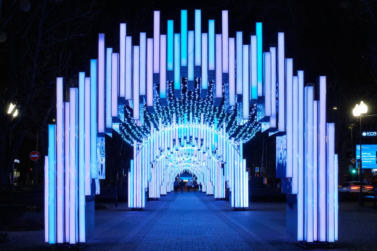 Пешеходная аллея оформлена серией световых арок с динамическими RGB-трубками и гирляндой нить, формирующей свод из сияющих линий. Световые элементы создают эффект движения и «дыхания» света, превращая обычный проход в интерактивную световую инсталляцию.