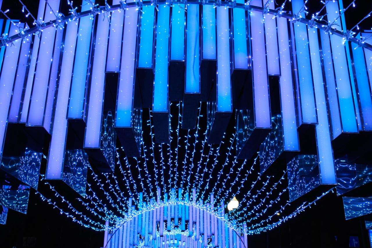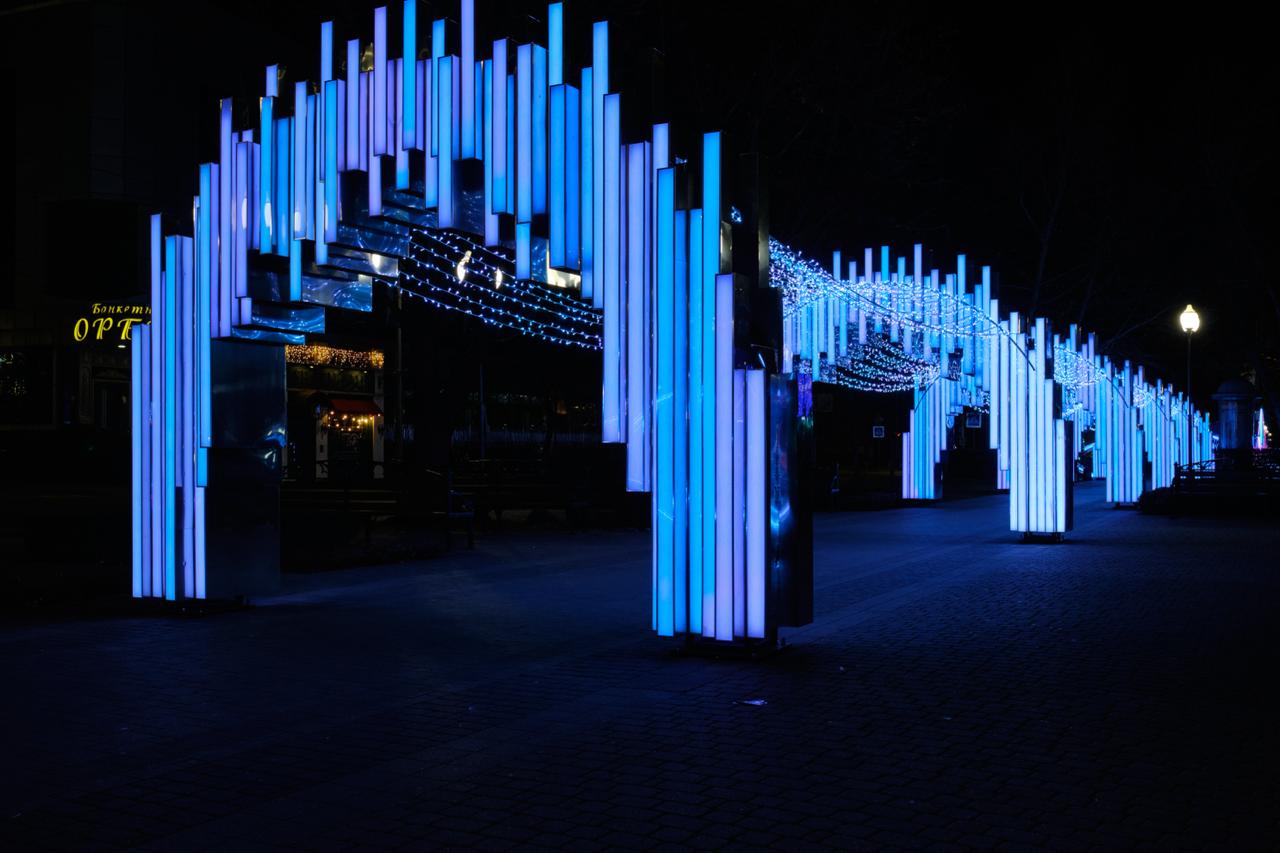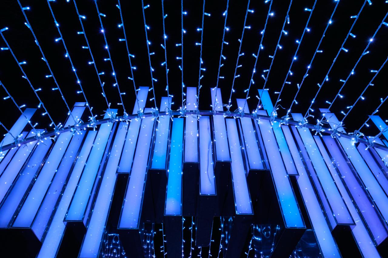 Пешеходная аллея оформлена серией световых арок с динамическими RGB-трубками и гирляндой нить, формирующей свод из сияющих линий. Световые элементы создают эффект движения и «дыхания» света, превращая обычный проход в интерактивную световую инсталляцию.