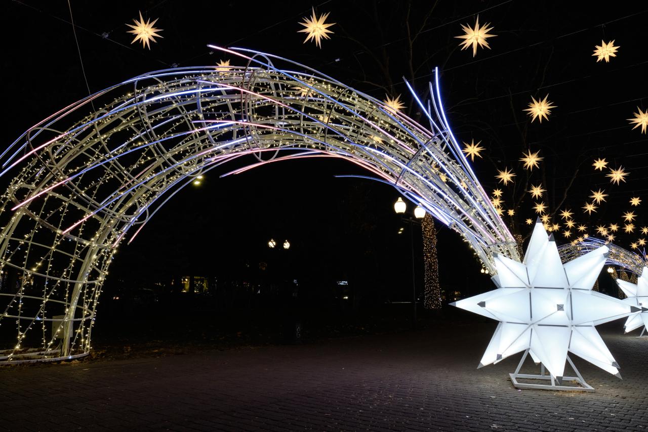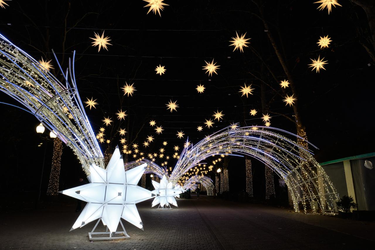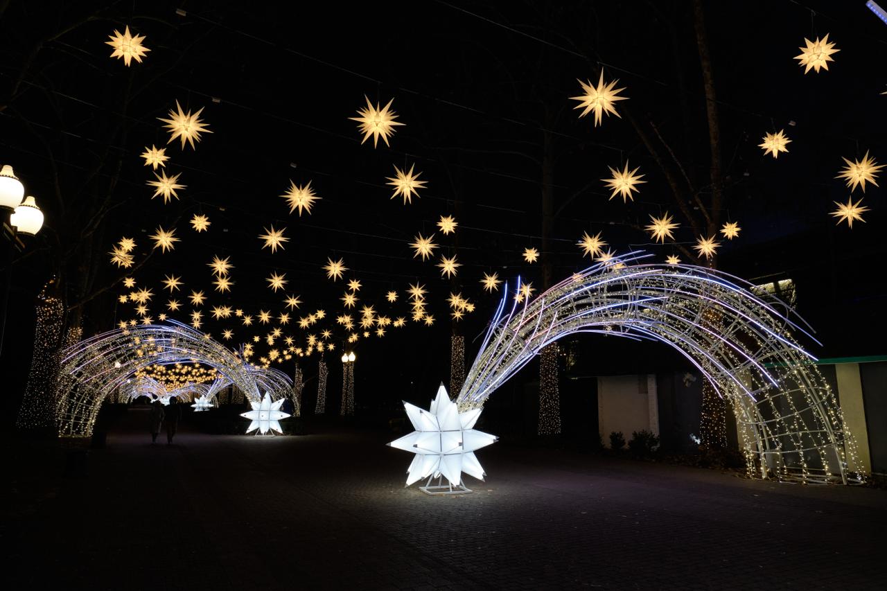 Пешеходная аллея украшена крупной световой инсталляцией с элементами в форме звёзд и арок.
