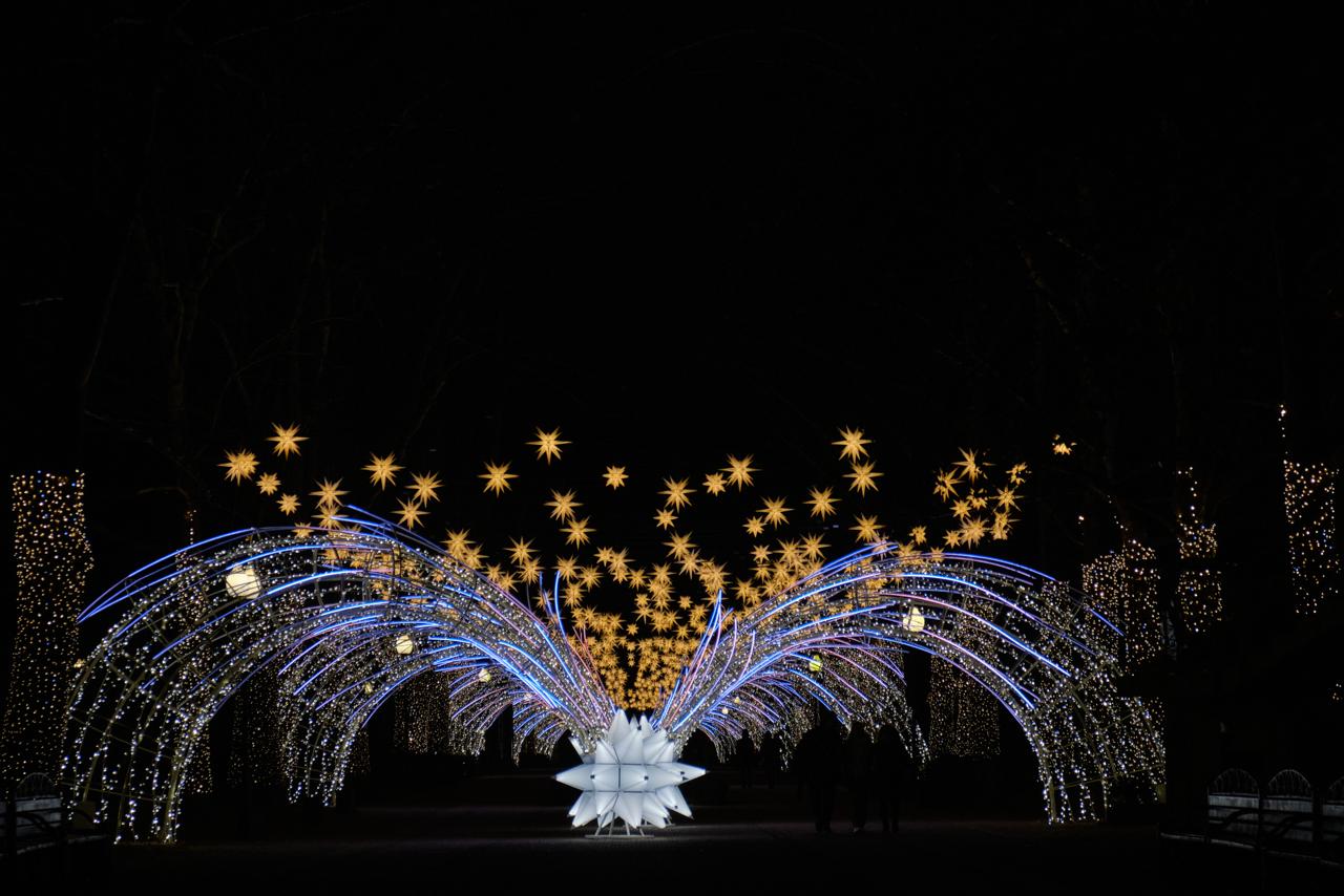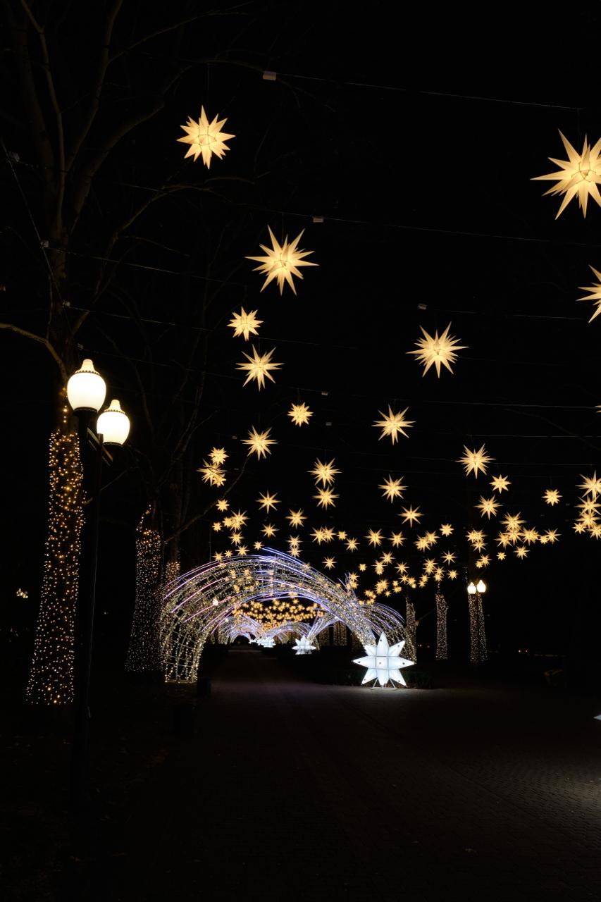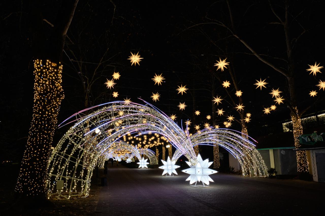 Пешеходная аллея украшена крупной световой инсталляцией с элементами в форме звёзд и арок.