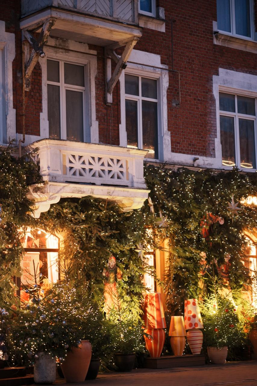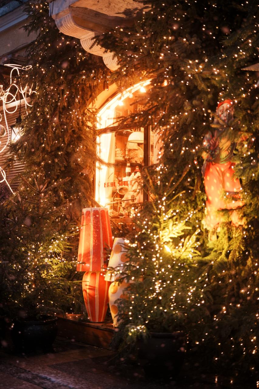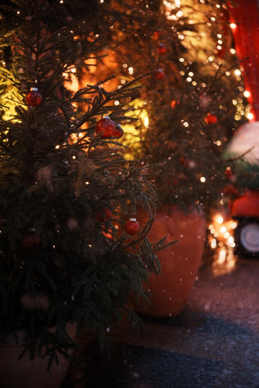 Вечером фасад превращается в уютную рождественскую витрину: живые ели, тёплое свечение и декоративные элементы — всё создаёт ощущение уюта и праздника. Лёгкий блеск на ветках подчёркивает фактуру хвои и делает композицию естественной.