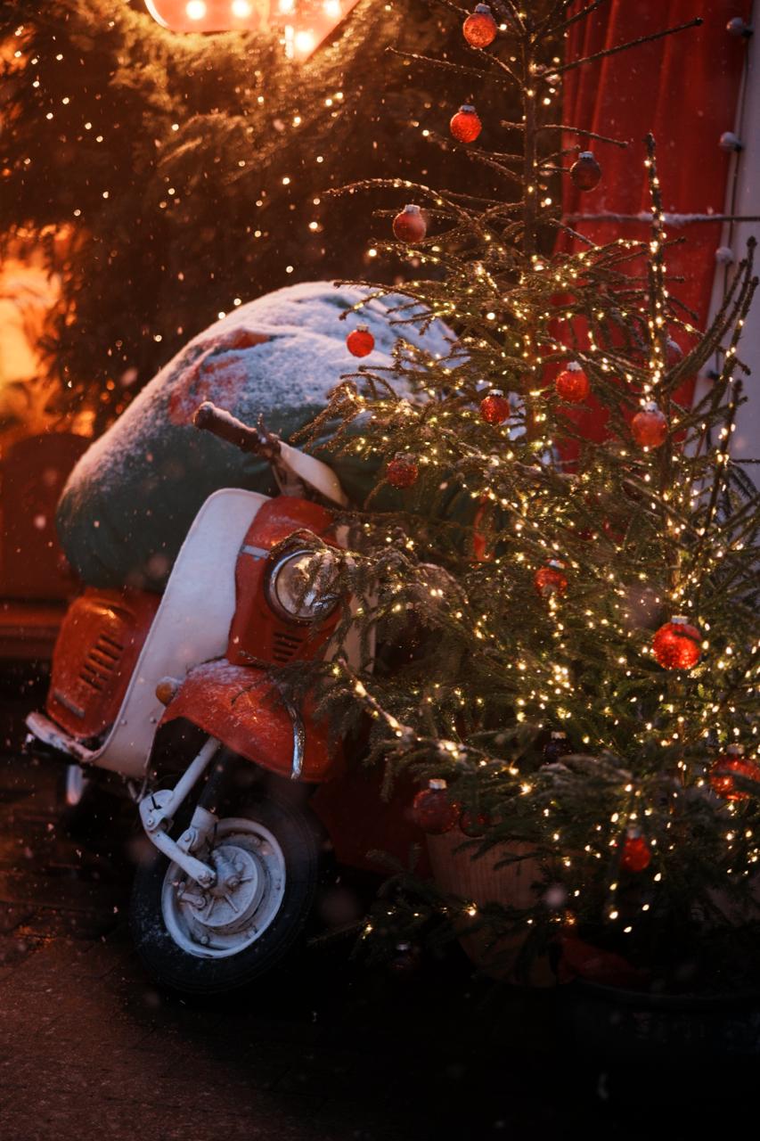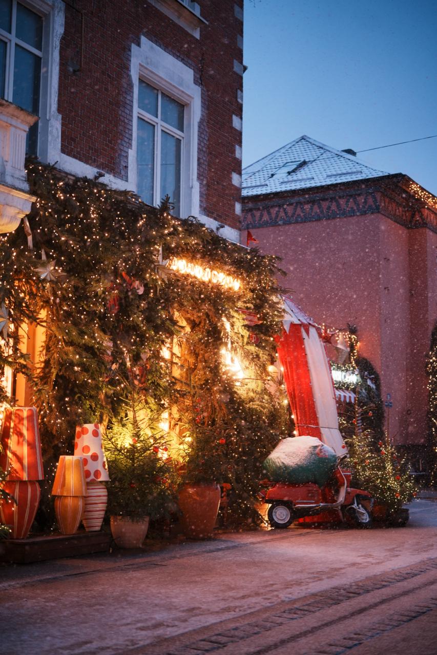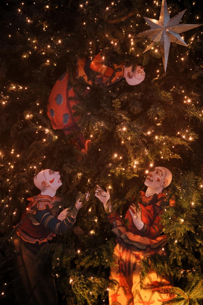 Вечером фасад превращается в уютную рождественскую витрину: живые ели, тёплое свечение и декоративные элементы — всё создаёт ощущение уюта и праздника. Лёгкий блеск на ветках подчёркивает фактуру хвои и делает композицию естественной.