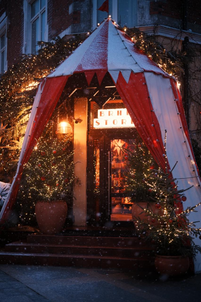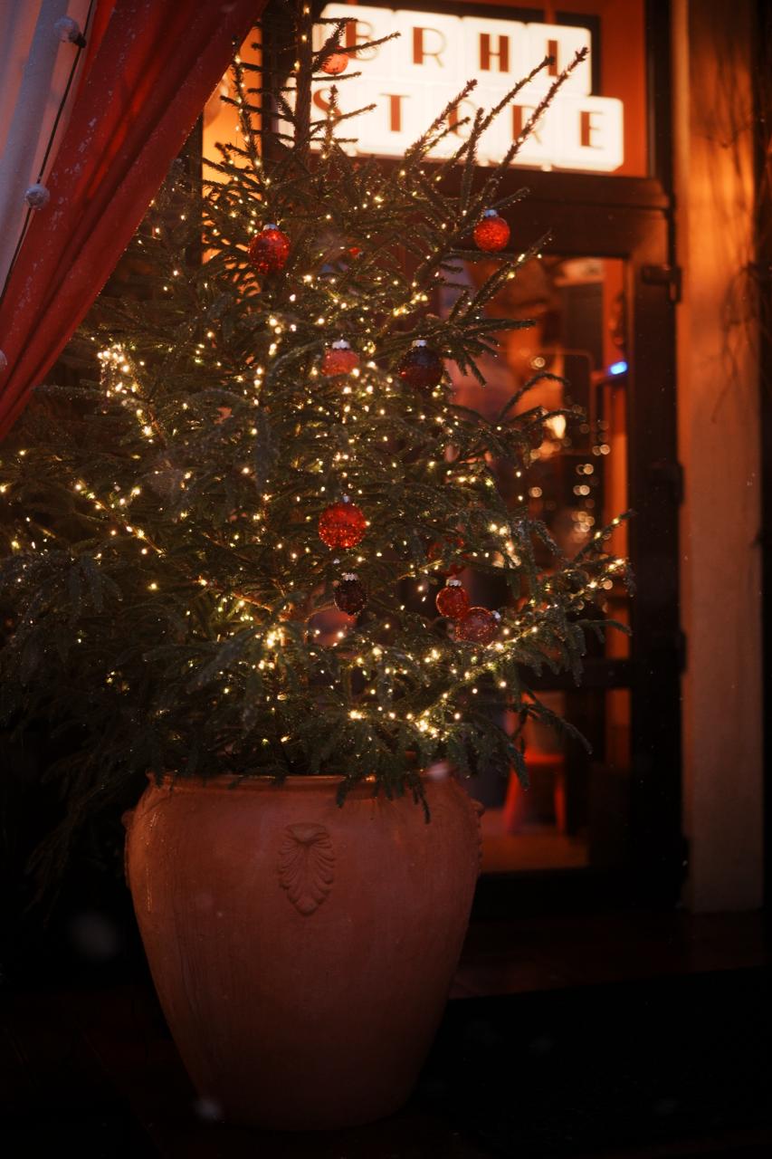 Фасад ресторана украшен живыми елями и еловыми ветками с гирляндой-нитью тёплого белого свечения. По периметру окон проложен белт-лайт, создающий мягкое свечение и подчёркивающий архитектуру здания. Свет гармонично сочетается с зеленью и природным декором, создавая атмосферу зимней сказки.