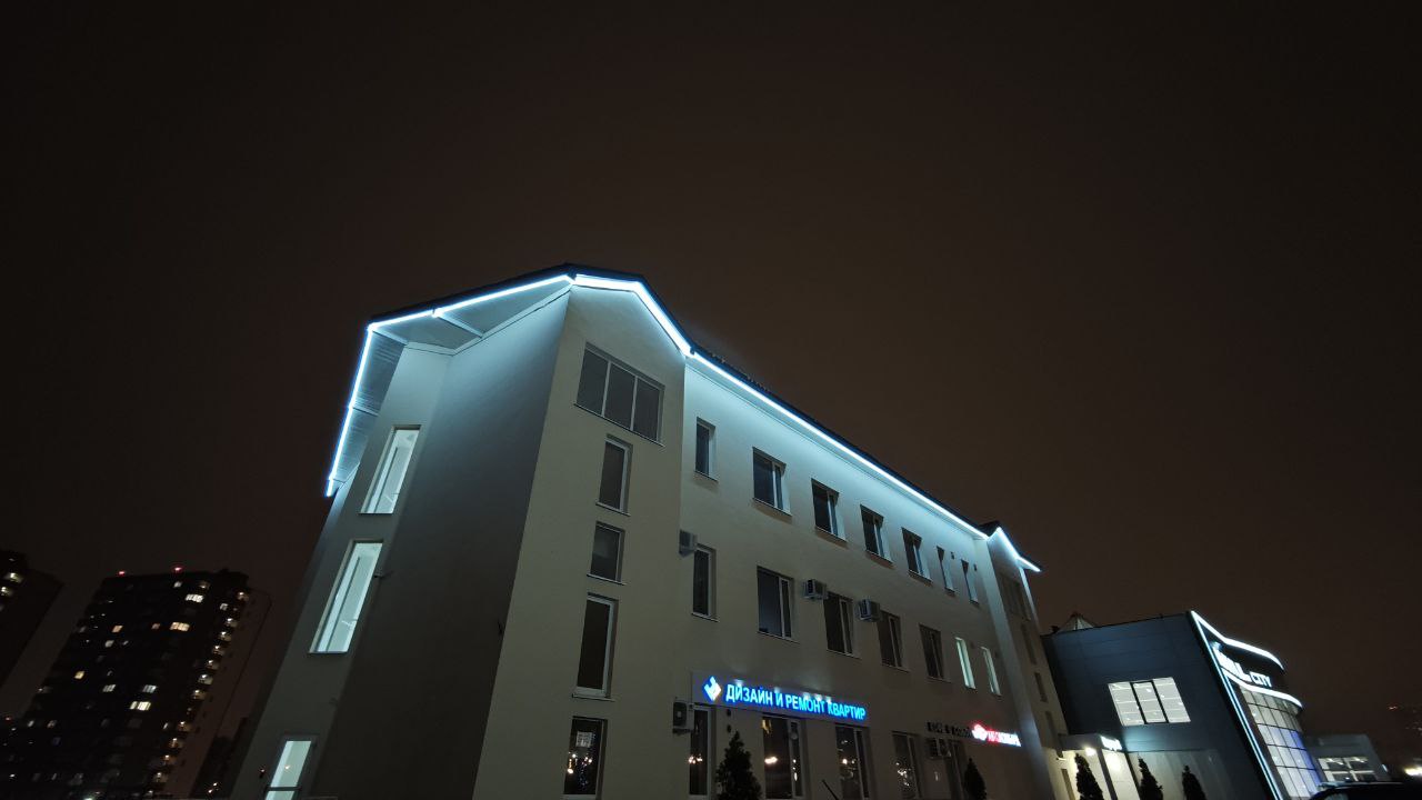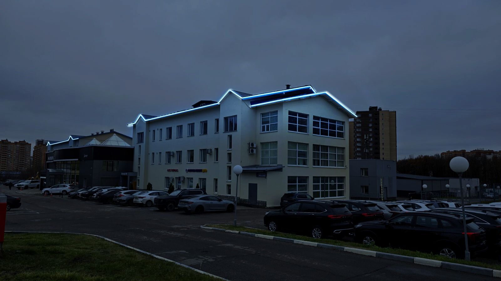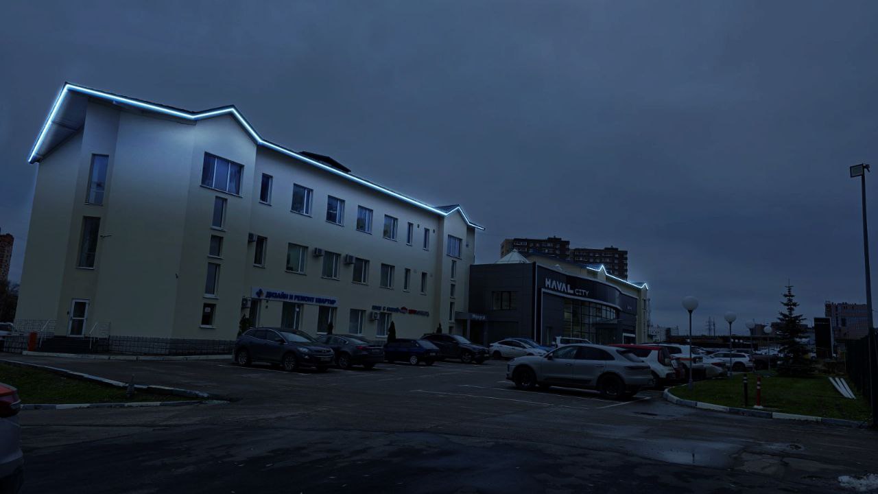 Фасад офисного здания оформлен контурной подсветкой холодного белого свечения. Линия света подчёркивает геометрию крыши и выделяет здание в вечернее время, создавая современный городской акцент.