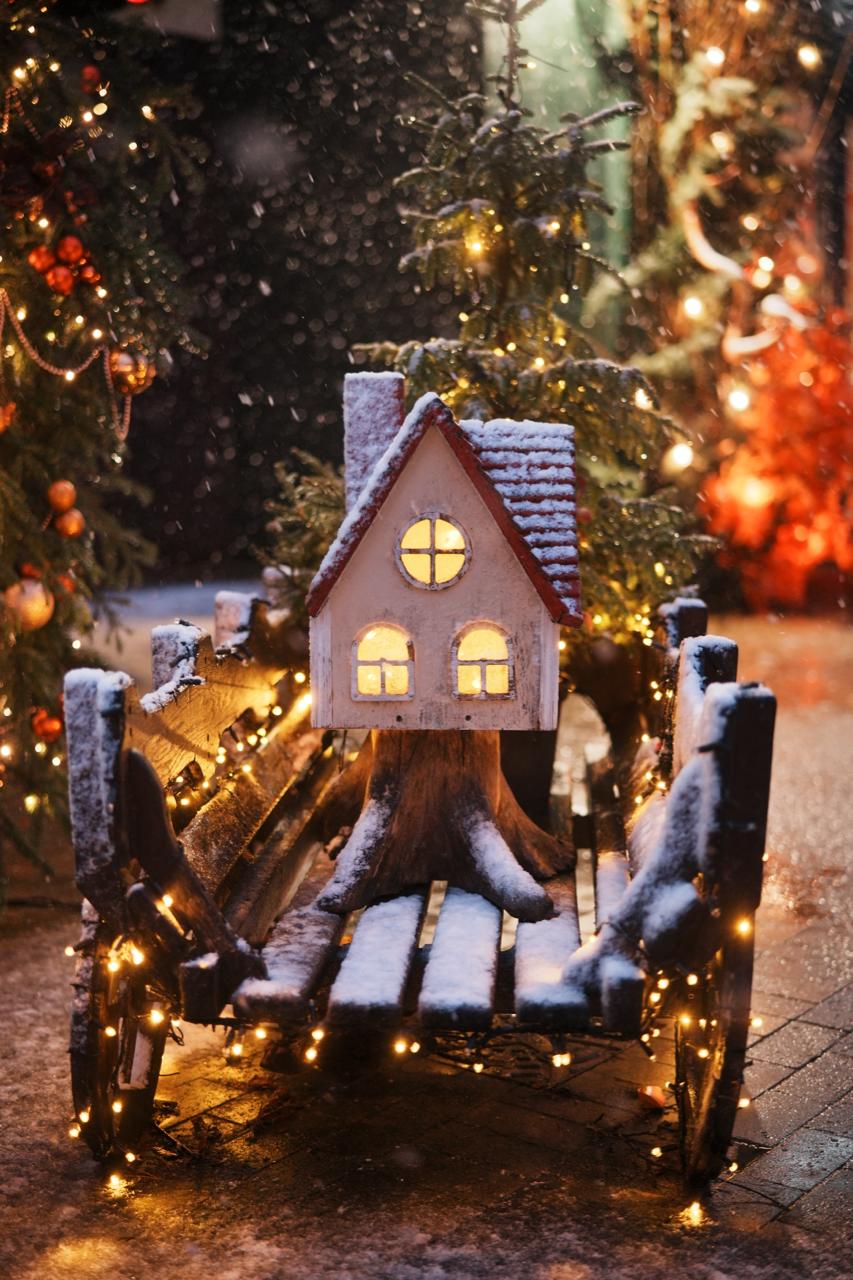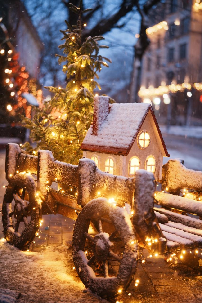 Концепция проекта — создать уютный зимний уголок, который будет радовать прохожих и подчеркивать атмосферу праздника. Основой стала деревянная повозка с декоративным домиком, символизирующим тепло и семейный очаг.