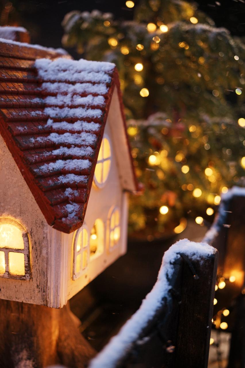 Композиция гармонично вписывается в городскую среду: в вечернее время домик светится изнутри, ели отражают золотое сияние, а снежный покров усиливает эффект уюта. Пространство становится местом притяжения и вызывает эмоциональный отклик у жителей и гостей.