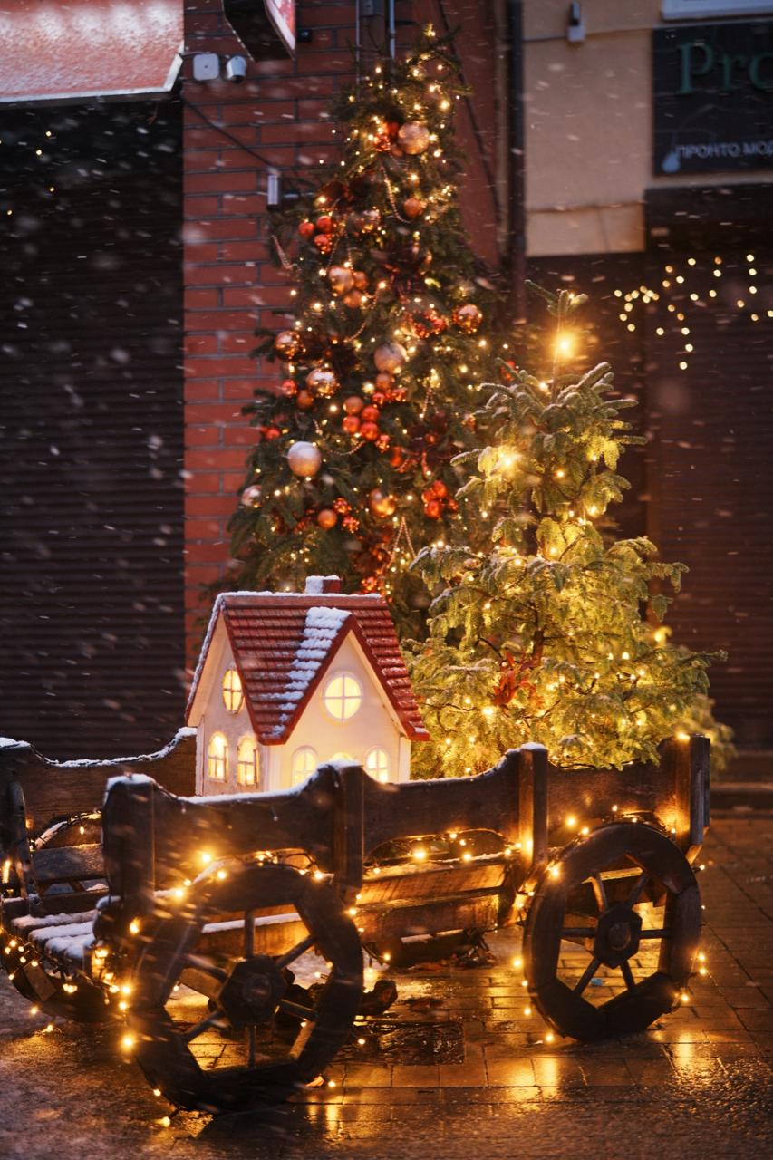 Вдоль композиции использованы гирлянды с тёплым белым свечением. Свет обвивает колёса и контуры повозки, мягко подсвечивает еловые ветви и украшения. Такое решение подчёркивает текстуру дерева и создаёт «живое» мерцание, заметное даже издалека.