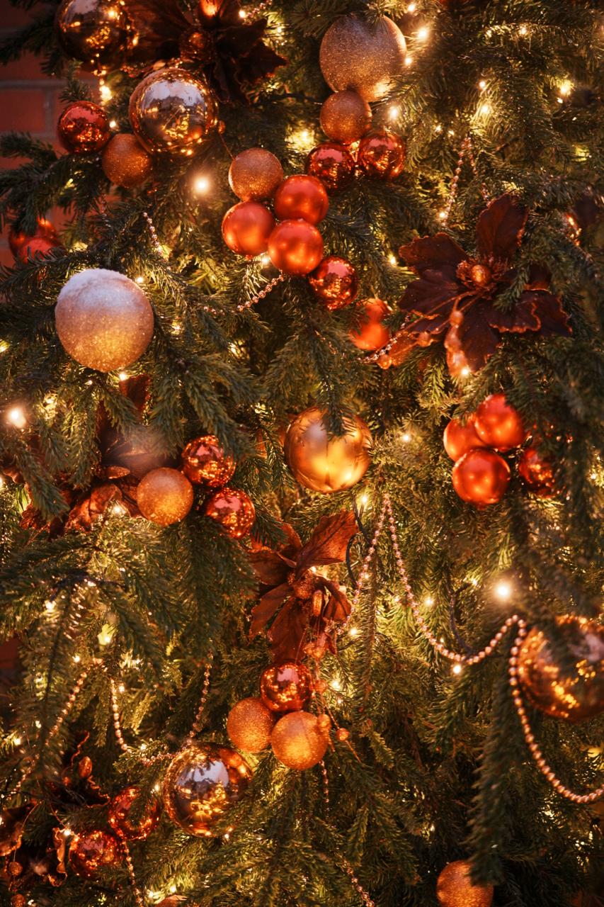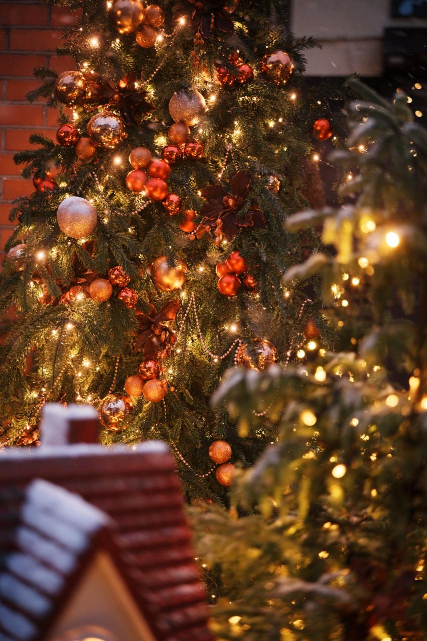 Праздничная композиция у входа объединяет живые ели, декоративный домик и световые гирлянды тёплого свечения. Инсталляция создаёт атмосферу уюта и становится естественной фотозоной для посетителей. Композиция выполнена в классическом рождественском стиле с акцентом на мягкий золотой свет и натуральные материалы.