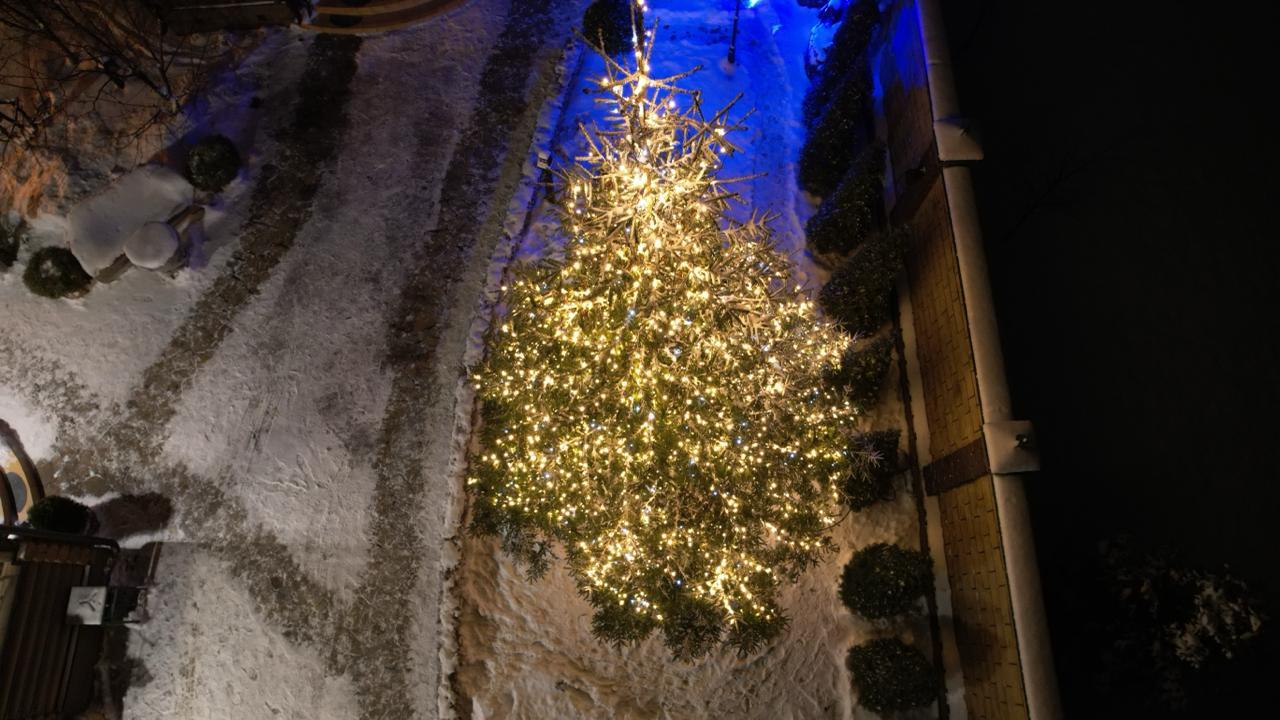 В Санниково живая ель превратилась в праздничный символ благодаря световым гирляндам. Монтаж выполнили электромонтажник и промальпинист с автовышки — это позволило равномерно подсветить всё дерево. Такой формат можно применять и на частных участках, и в городских пространствах: решение экологично (нет необходимости в искусственной ели) и экономно, а эффект при этом выглядит максимально празднично.
