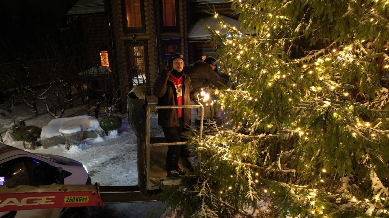 Работы проводились с использованием автовышки: электромонтажник и промальпинист равномерно распределили гирлянды по всей высоте ели. Такое решение позволяет украсить даже очень высокие деревья.