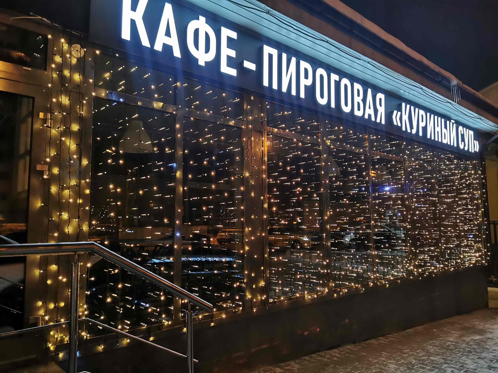 Фасад кафе-пироговой «Куриный суп» украшен гирляндой-занавесом тёплого белого света. Сотни светодиодов мягко подсвечивают окна и создают праздничное настроение, делая кафе заметным и уютным в вечерние часы.