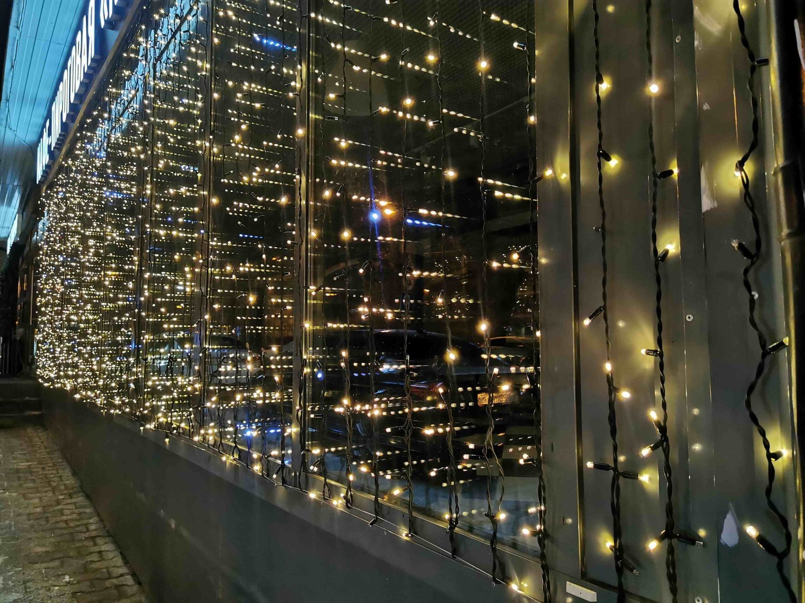 Такое решение подчёркивает витрины, делает кафе более заметным и визуально приглашает гостей внутрь. Гирлянда-занавес стала простым, но выразительным способом добавить уюта и праздничного настроения в облик заведения.