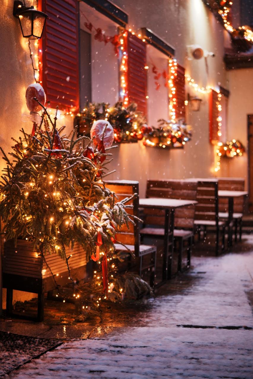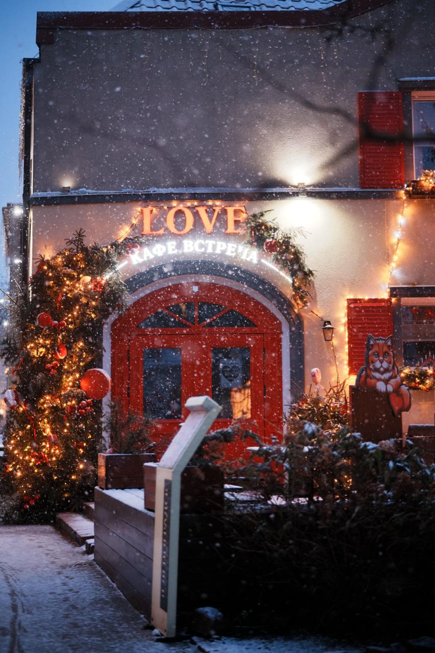 Вечером фасад кафе выглядит особенно уютно: тёплый свет гирлянд гармонирует с зимним декором и снегом, а яркие акценты из красных и золотых украшений добавляют динамики. Такое оформление не только подчёркивает фасад здания, но и делает кафе заметной и привлекательной точкой для жителей и туристов.