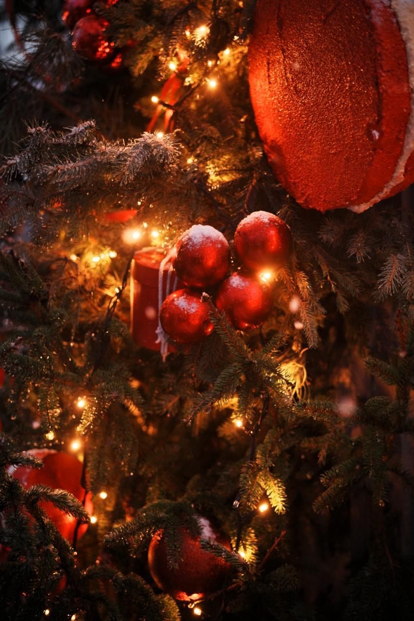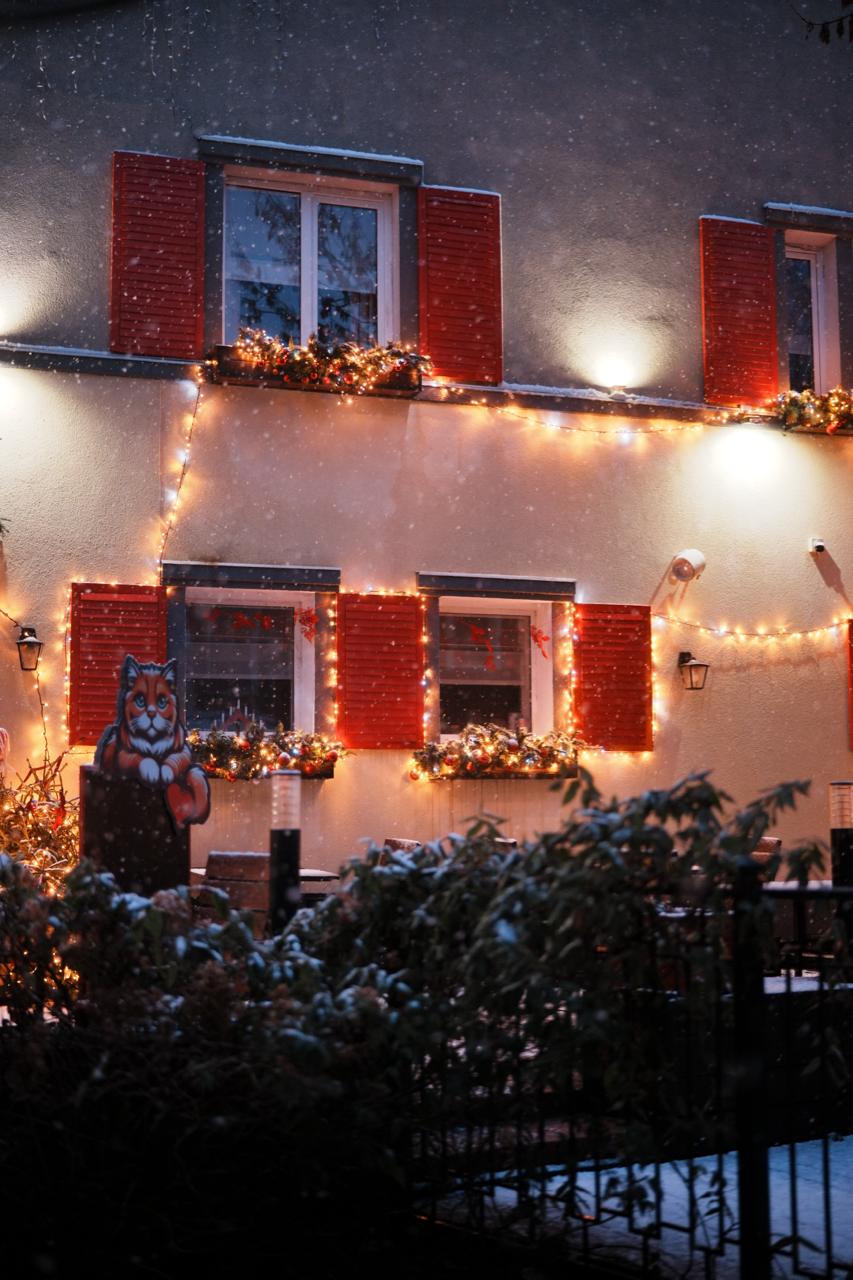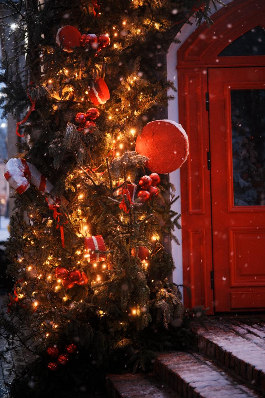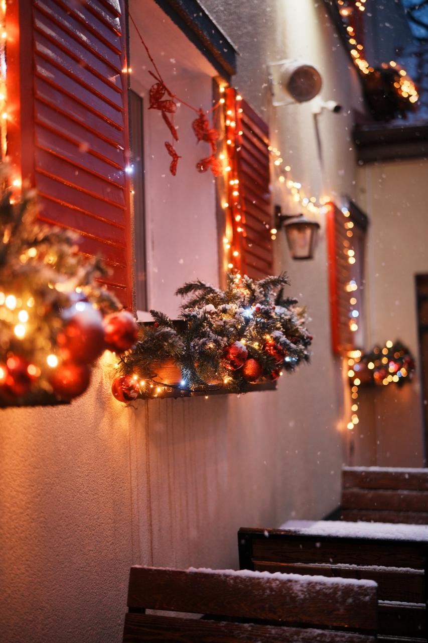 По контуру окон гирлянды добавляют чёткие световые линии, которые выделяют фасад в вечернее время. Дополнительный декор с еловыми ветками и шарами усиливает праздничное настроение.