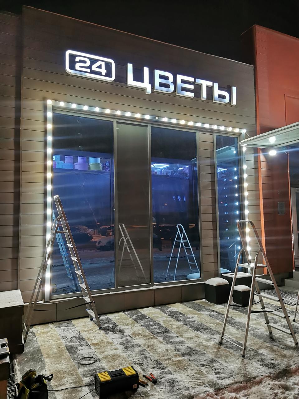 Для цветочного магазина «24 часа» была выполнена подсветка витрин холодным белым белт-лайтом. Подсветка обрамляет витрину по периметру и делает фасад максимально заметным даже поздно вечером и ночью, когда особенно важно привлекать клиентов.