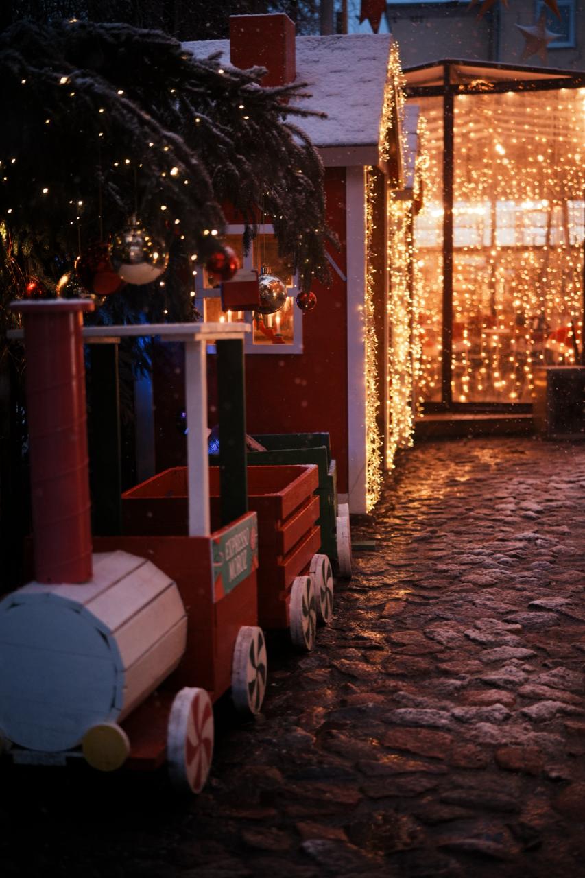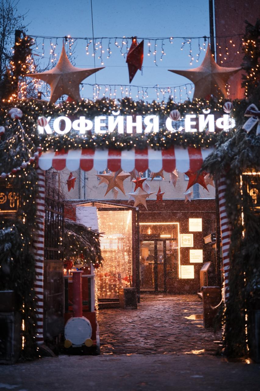 Вечером кофейня выглядит как рождественская открытка: мерцающие огни, снежные гирлянды и приглушённое свечение окон создают ощущение тепла и праздника. Место стало фотозоной и точкой притяжения для гостей квартала.