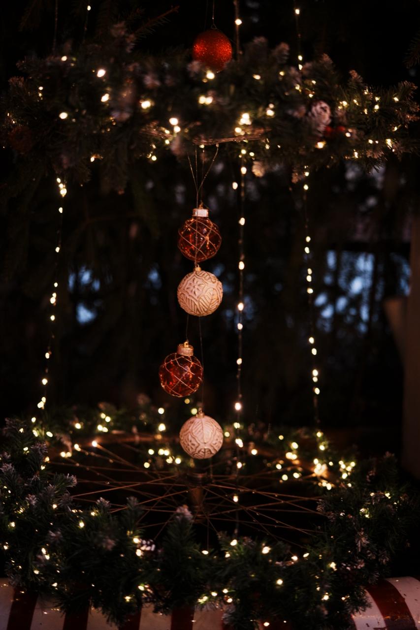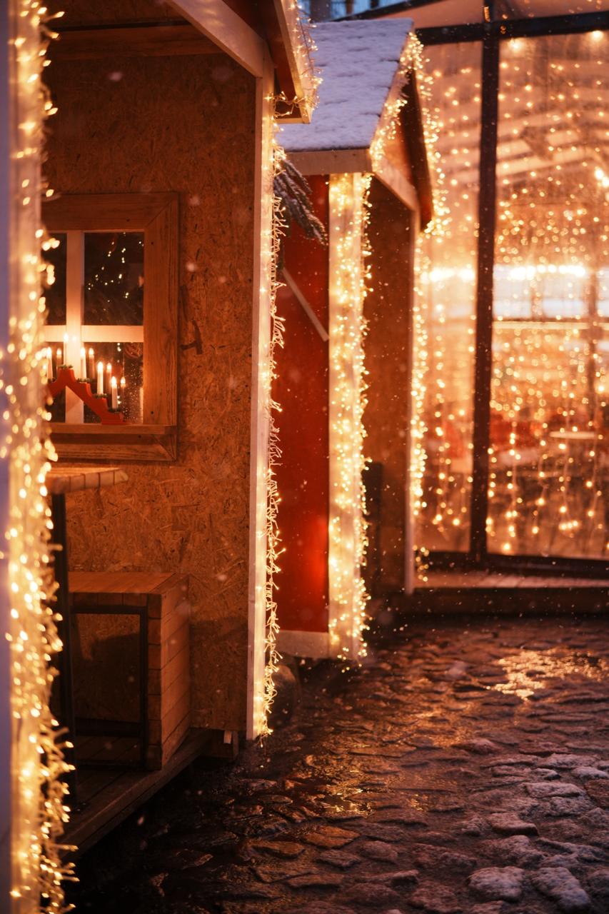 Гирлянды тёплого белого свечения образуют мягкое свечение, которое гармонирует с уличным освещением. Свет неяркий, но достаточно выразительный, чтобы привлечь внимание прохожих и создать уютную атмосферу.