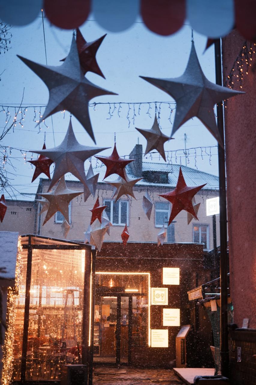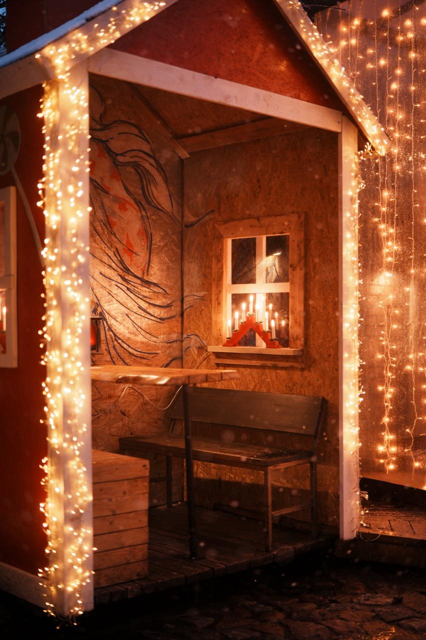 Фасад и внутренний двор кофейни украшены гирляндами тёплого свечения, звёздами и декоративными элементами в новогодней стилистике. Пространство наполнено мягким светом, создающим атмосферу уюта и зимней сказки.