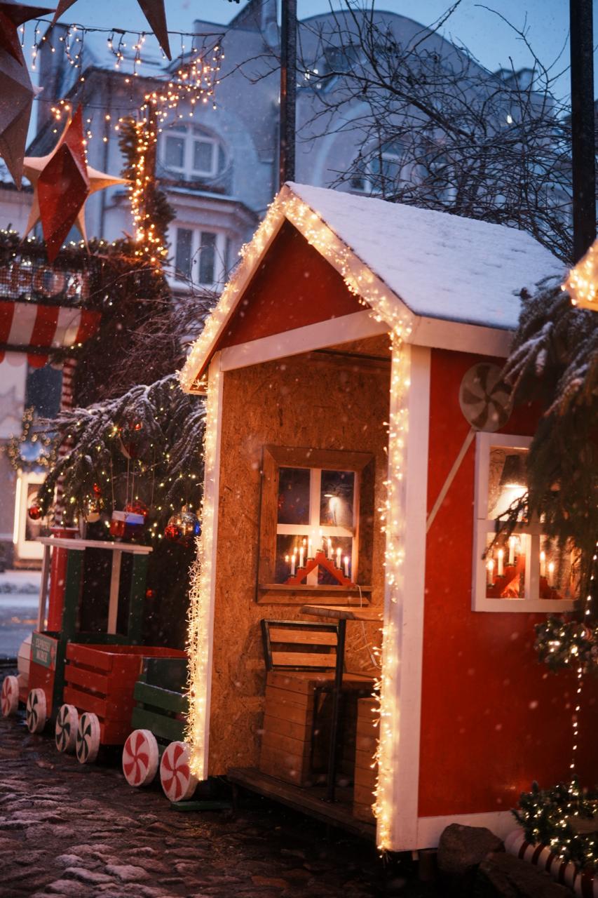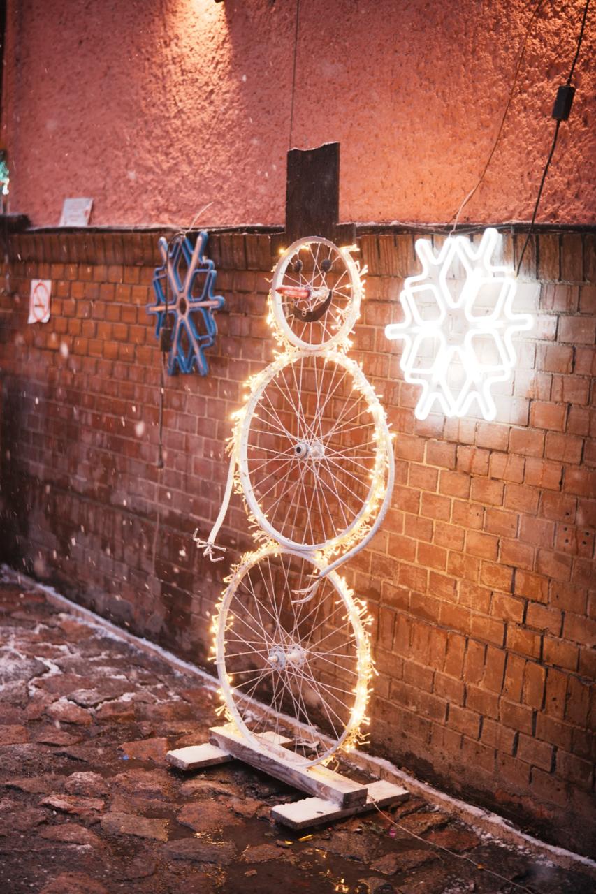 Фасад украшен гирляндами «нить» и «бахрома», звёздами и еловыми ветвями. В оформлении использованы световые снежинки и оригинальные элементы — фигура снеговика из велосипедных колёс и декоративный поезд у входа.