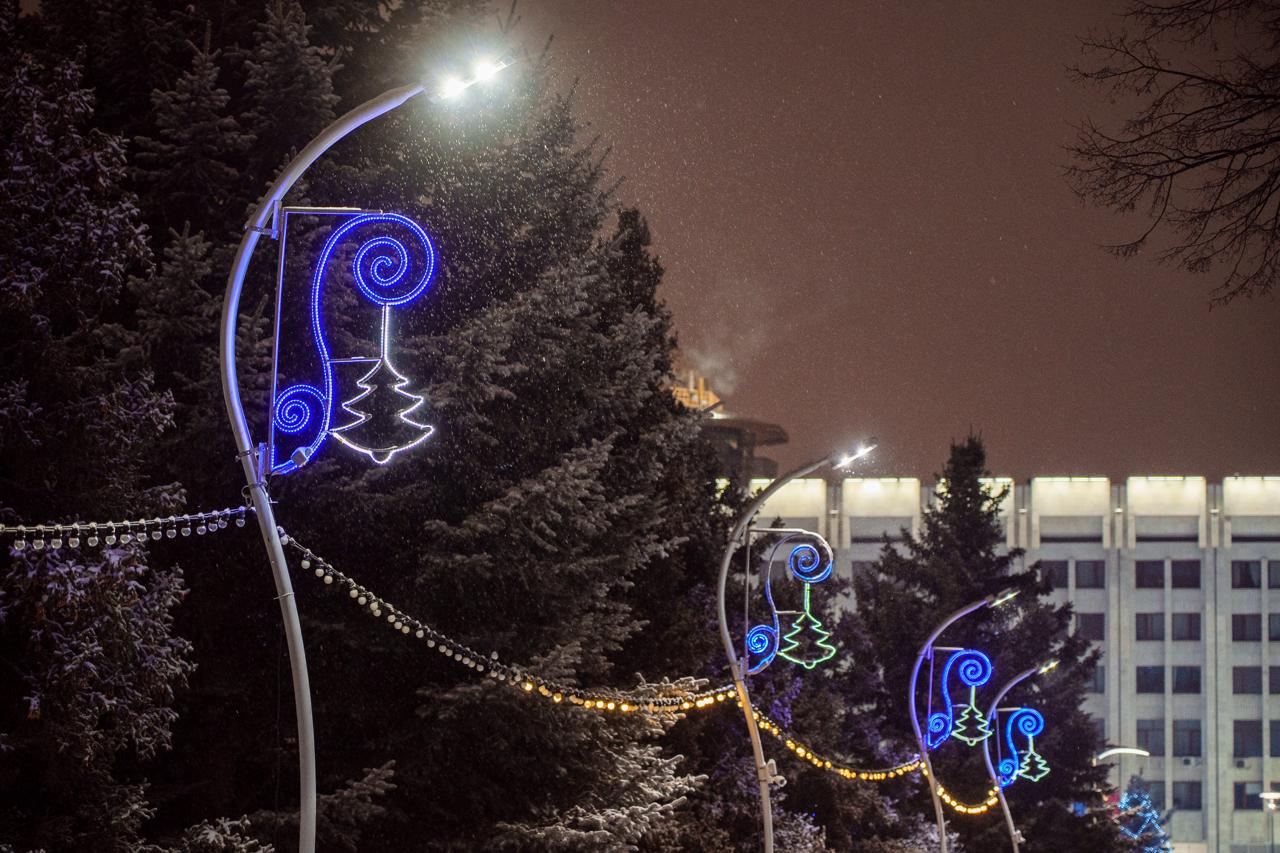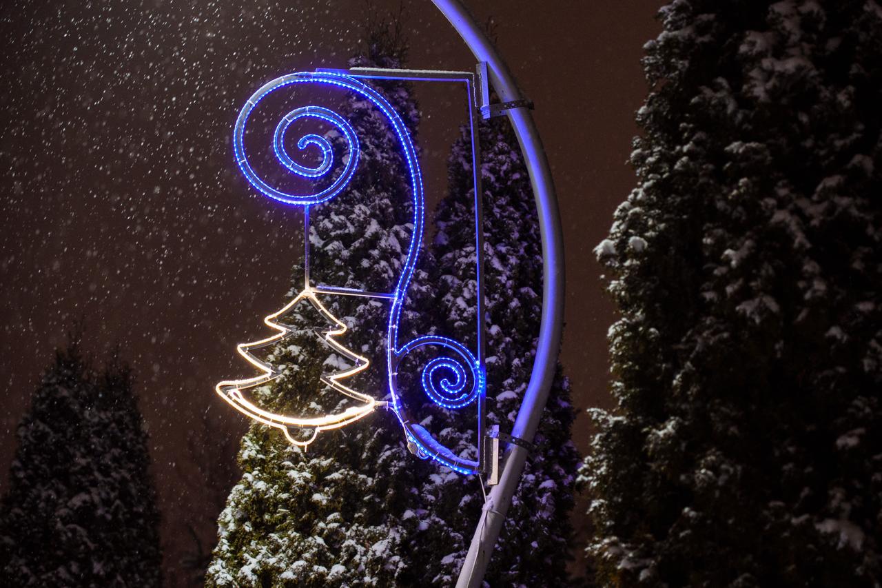 Улицы города к зимнему сезону украсили световыми консолями с элементами в виде ёлочек и декоративных завитков. Между опорами протянута гирлянда белт-лайт тёплого белого оттенка, создающая мягкое свечение и подчёркивающая праздничную атмосферу города.