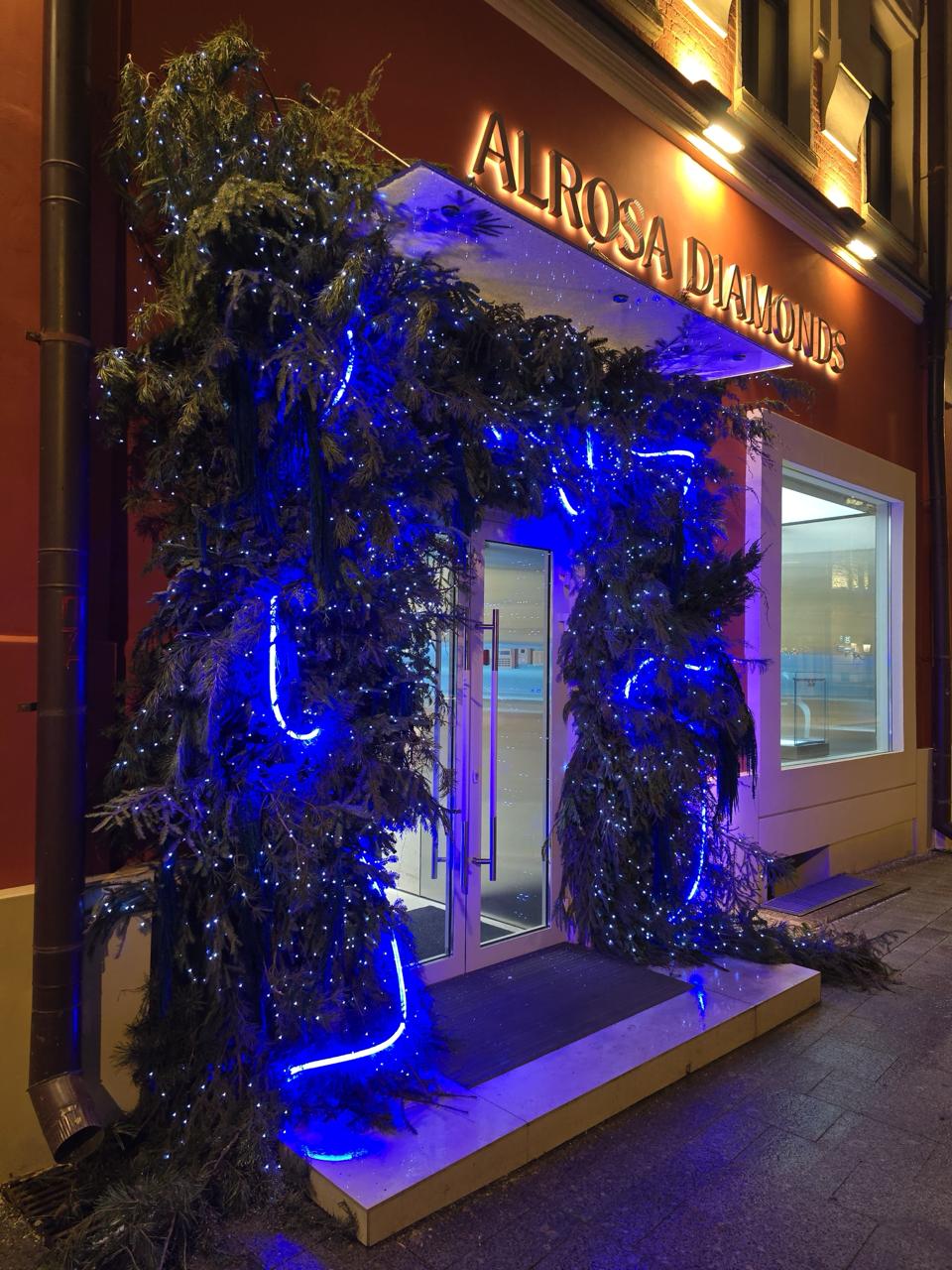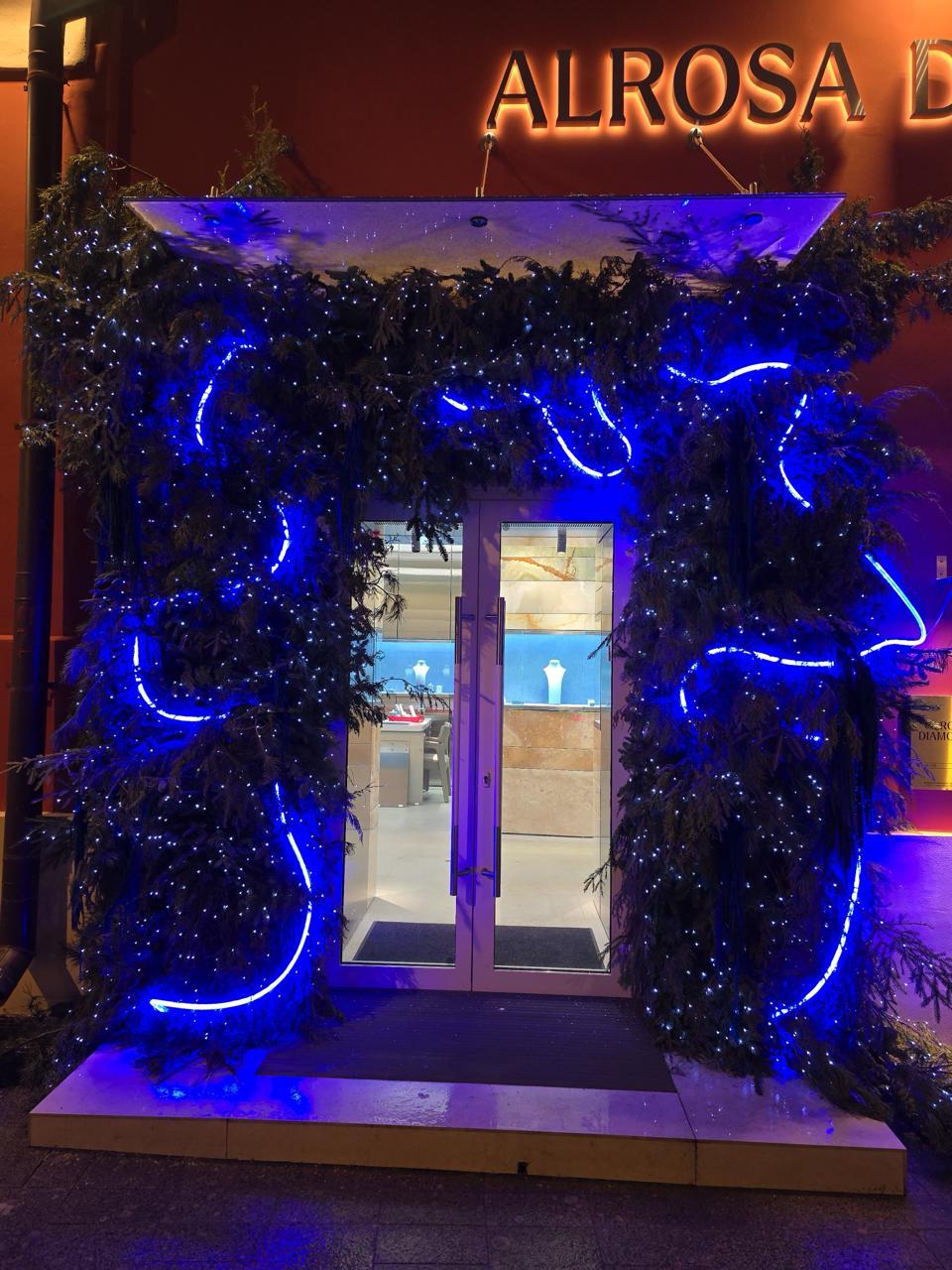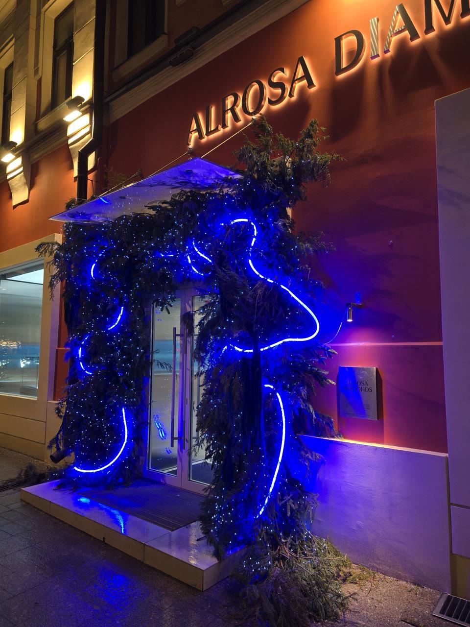 Входная группа ювелирного магазина Alrosa Diamonds в Москве украшена хвойной композицией с акцентами из гибкого неона синего цвета. Контраст зелени и холодного свечения создаёт премиальный облик фасада и подчёркивает статус бренда.