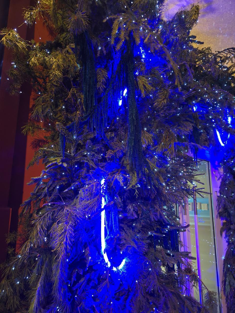 Контраст синего свечения и зелёной хвои создаёт ощущение роскоши и современного стиля. Такой приём подчёркивает тематику ювелирного магазина, вызывая ассоциации с драгоценными камнями и сиянием.