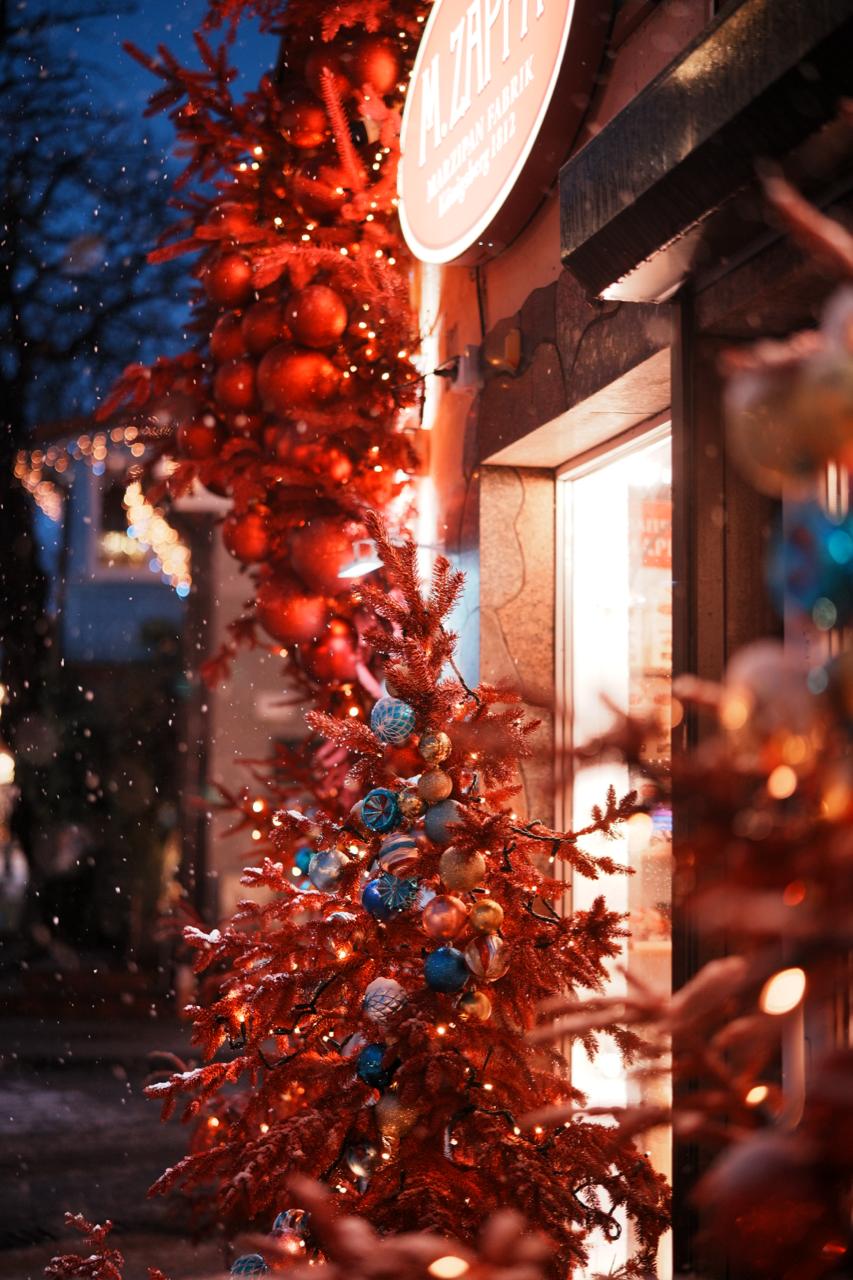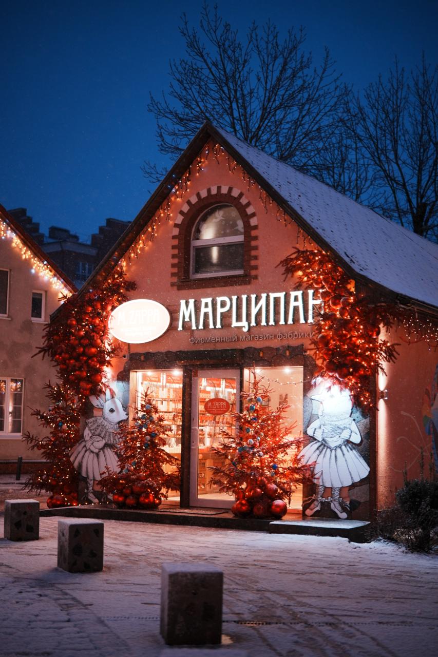 Тёплое свечение гирлянд и насыщенные цвета декора создают сказочное настроение. Магазин заметен издалека, а фасад становится ярким акцентом пешеходной улицы, привлекая внимание посетителей даже в вечерние часы.