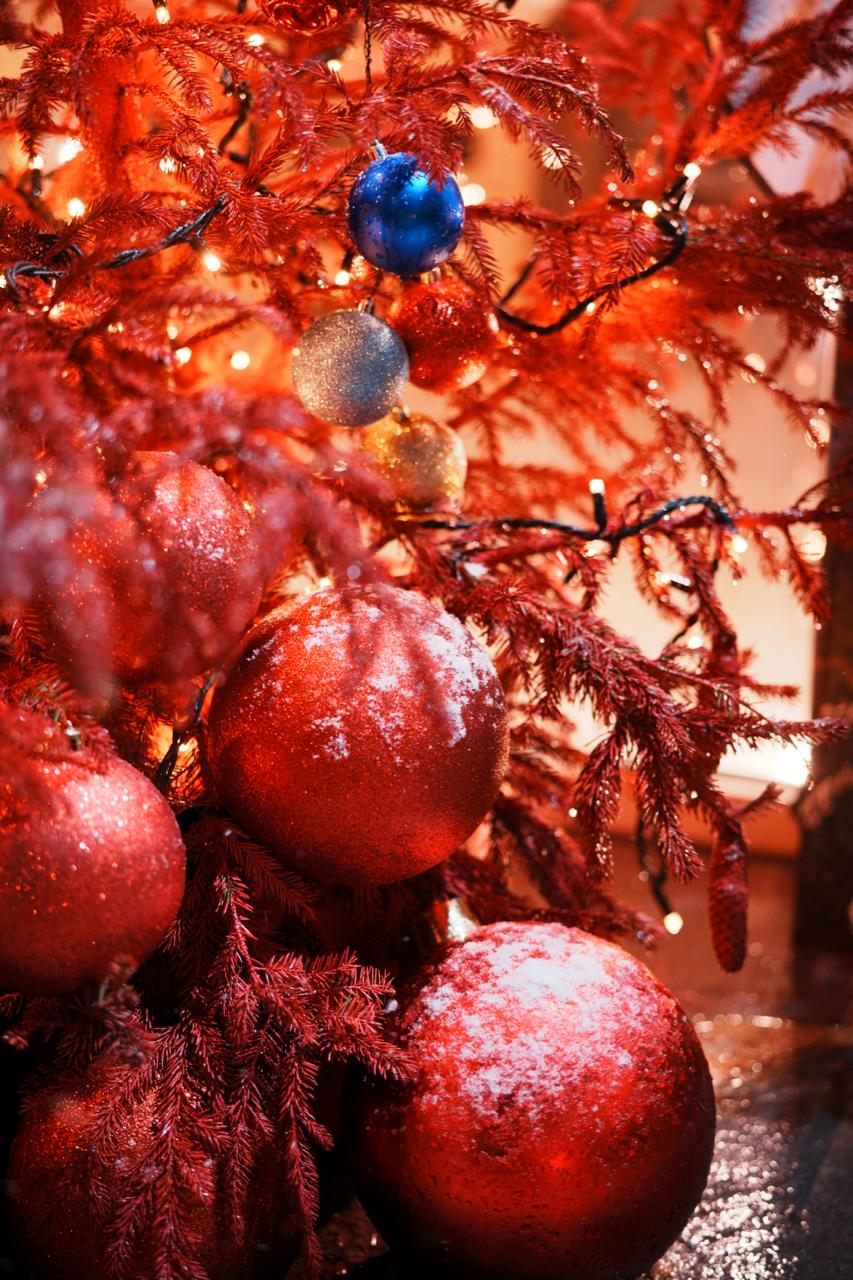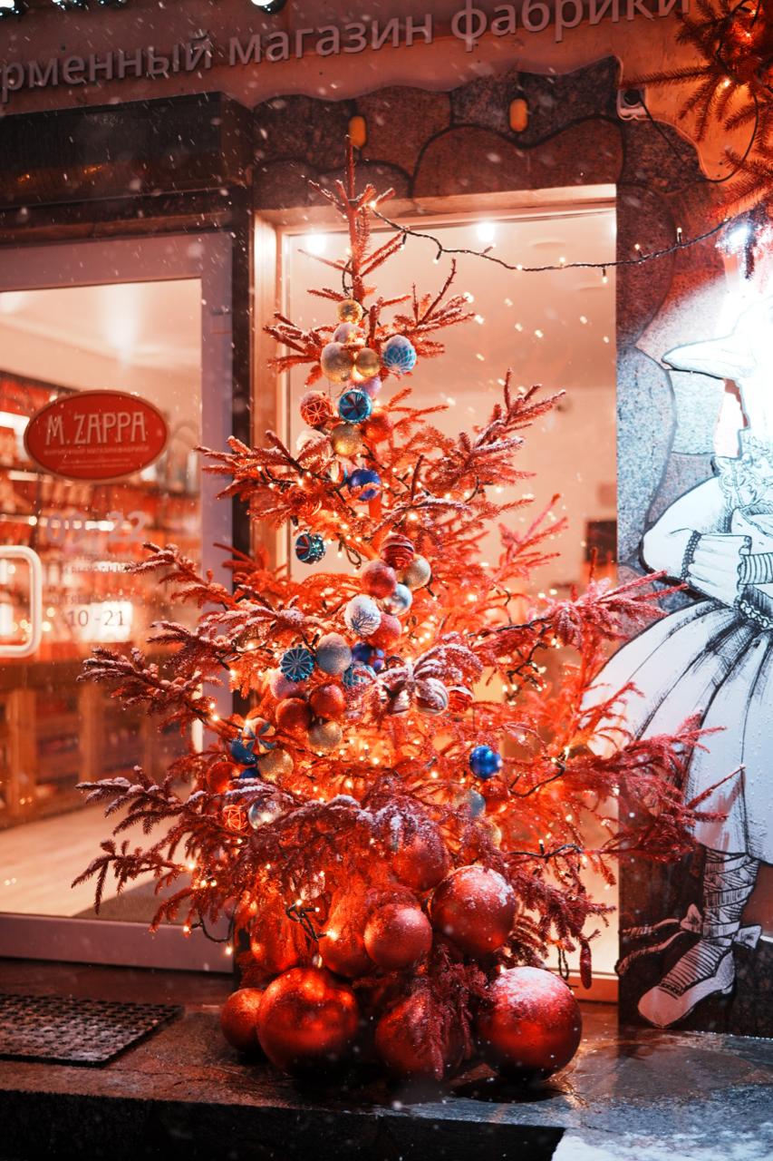 У входа размещены ели, оформленные гирляндой-нитью и крупными шарами красного, золотого и синего оттенков. Такое сочетание подчёркивает фирменный стиль магазина и создаёт эффект праздничной витрины.