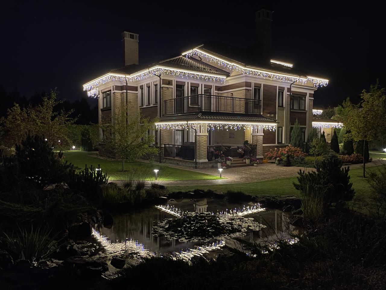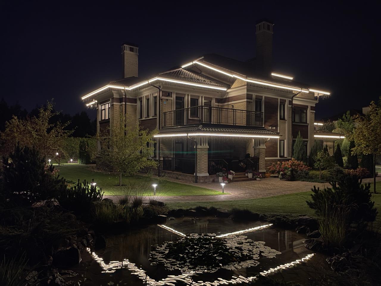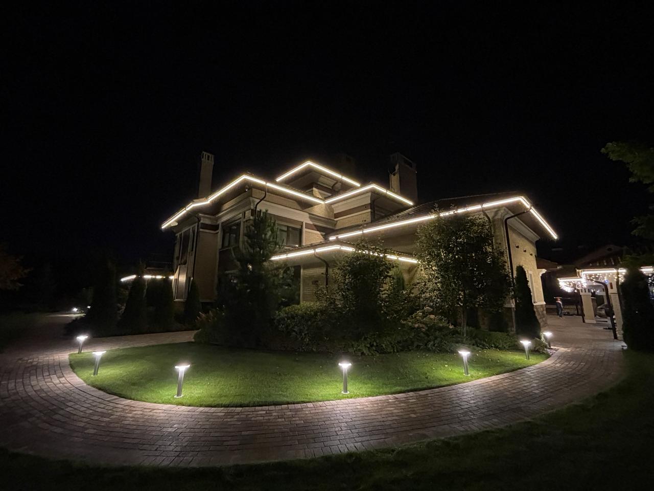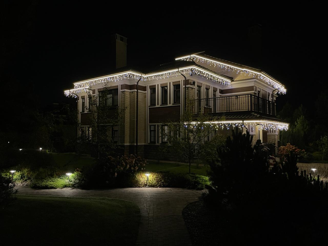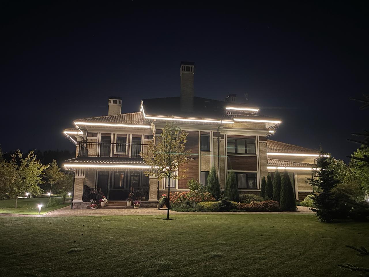 Загородный дом с красивой архитектурой в элитном посёлке терялся в темноте — фасад вечером был незаметен. Владелица хотела подчеркнуть контуры здания и создать выразительный образ с помощью тёплой контурной подсветки. Дополнительно планировалось добавить праздничную бахрому для уюта в зимний сезон и создать систему управления освещением через смартфон.