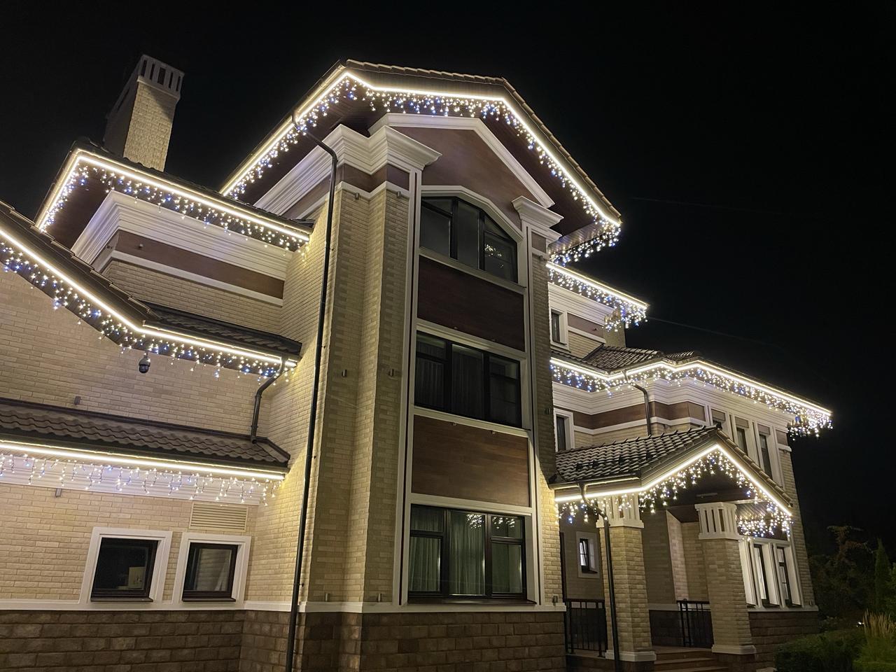 Дом стал выглядеть выразительно и дорого, выделяется среди соседних коттеджей. Тёплый свет подчёркивает архитектуру, а бахрома создаёт праздничное настроение.
