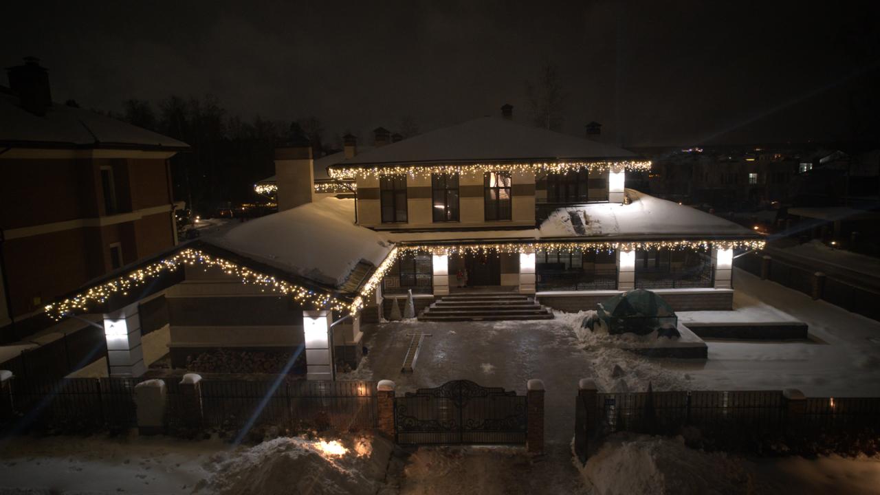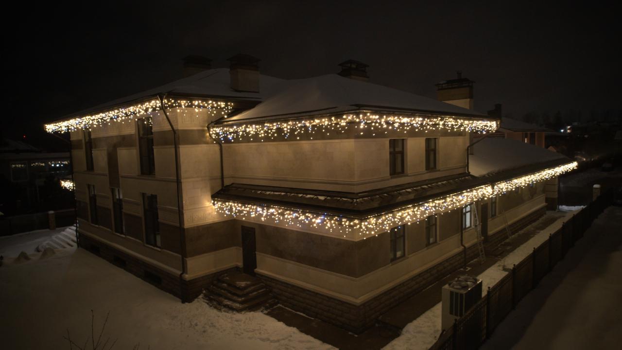 Крепление выполнено скрытым способом без повреждения фасада. Все соединения влагозащищены, провода аккуратно скрыты. Монтаж произведён с учётом особенностей архитектуры — разные высоты и углы кровли требуют точного расчёта и синхронизации световых линий.