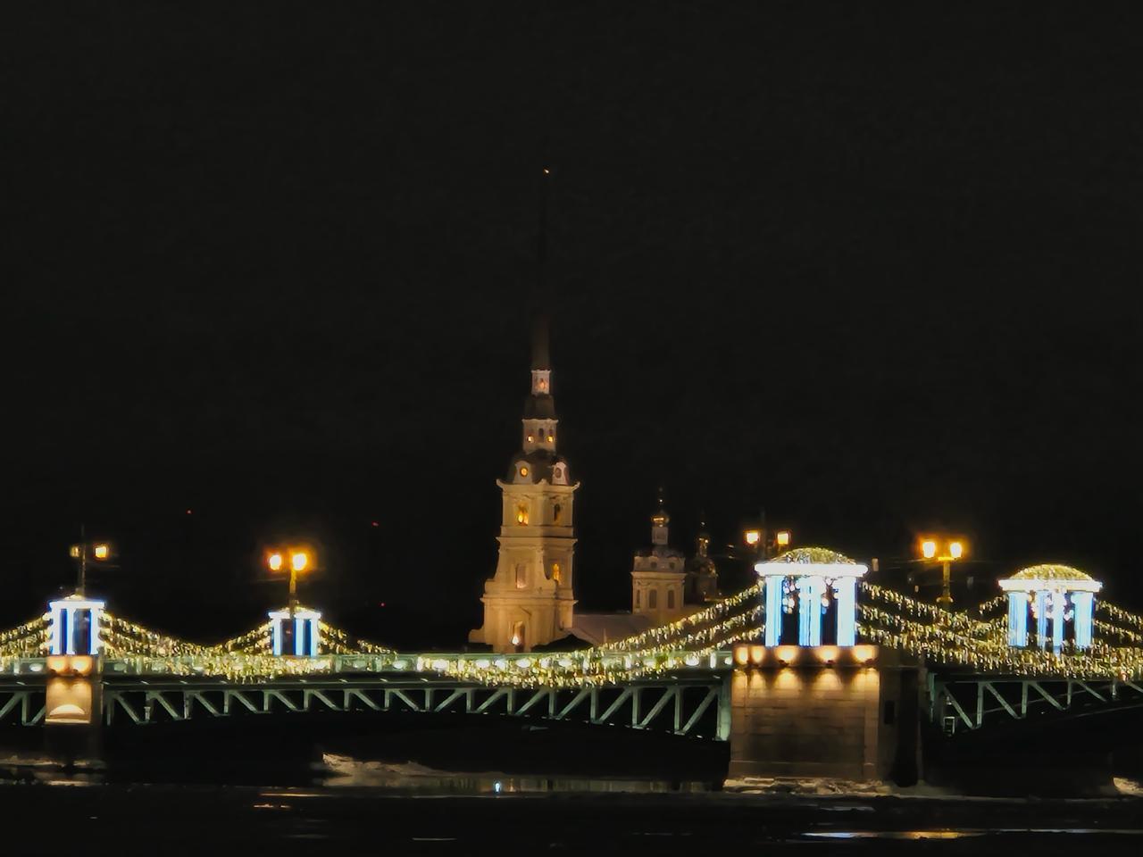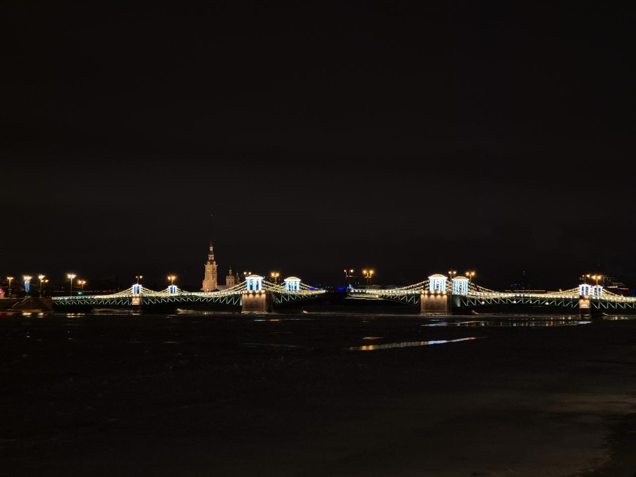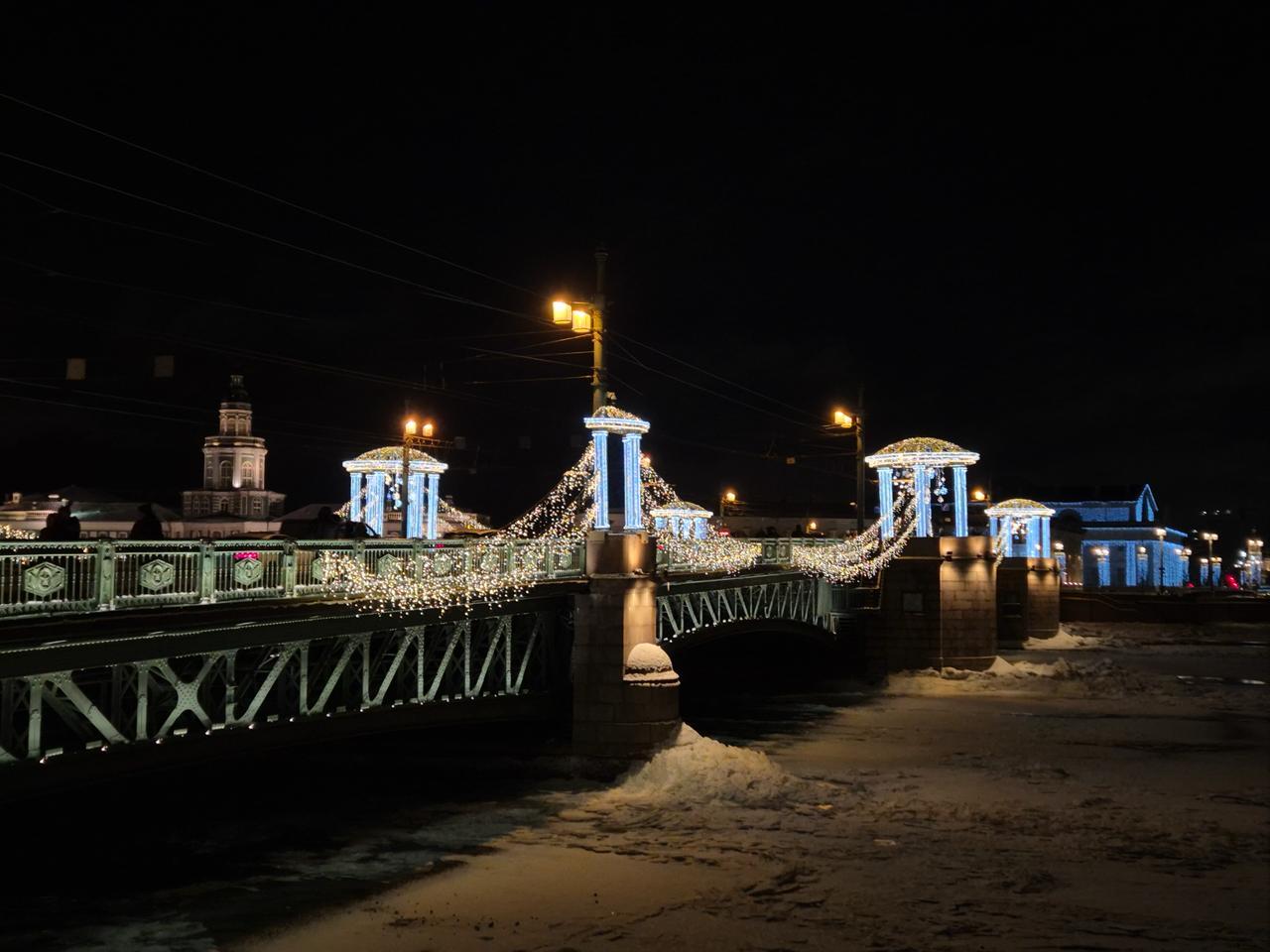 Световое оформление моста — это пример того, как художественная подсветка способна подчеркнуть значимость городской достопримечательности и сделать её символом зимнего города.