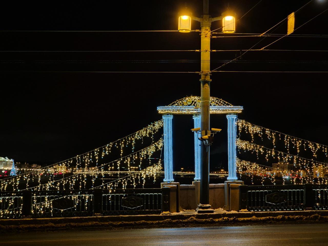 Зимой мост преображается благодаря праздничному световому оформлению. На пролётах и опорах смонтирована гирлянда-бахрома тёплого свечения, а архитектурные элементы дополнены световыми фигурами. В результате мост становится ярким акцентом вечернего города и гармонично вписывается в панораму реки.