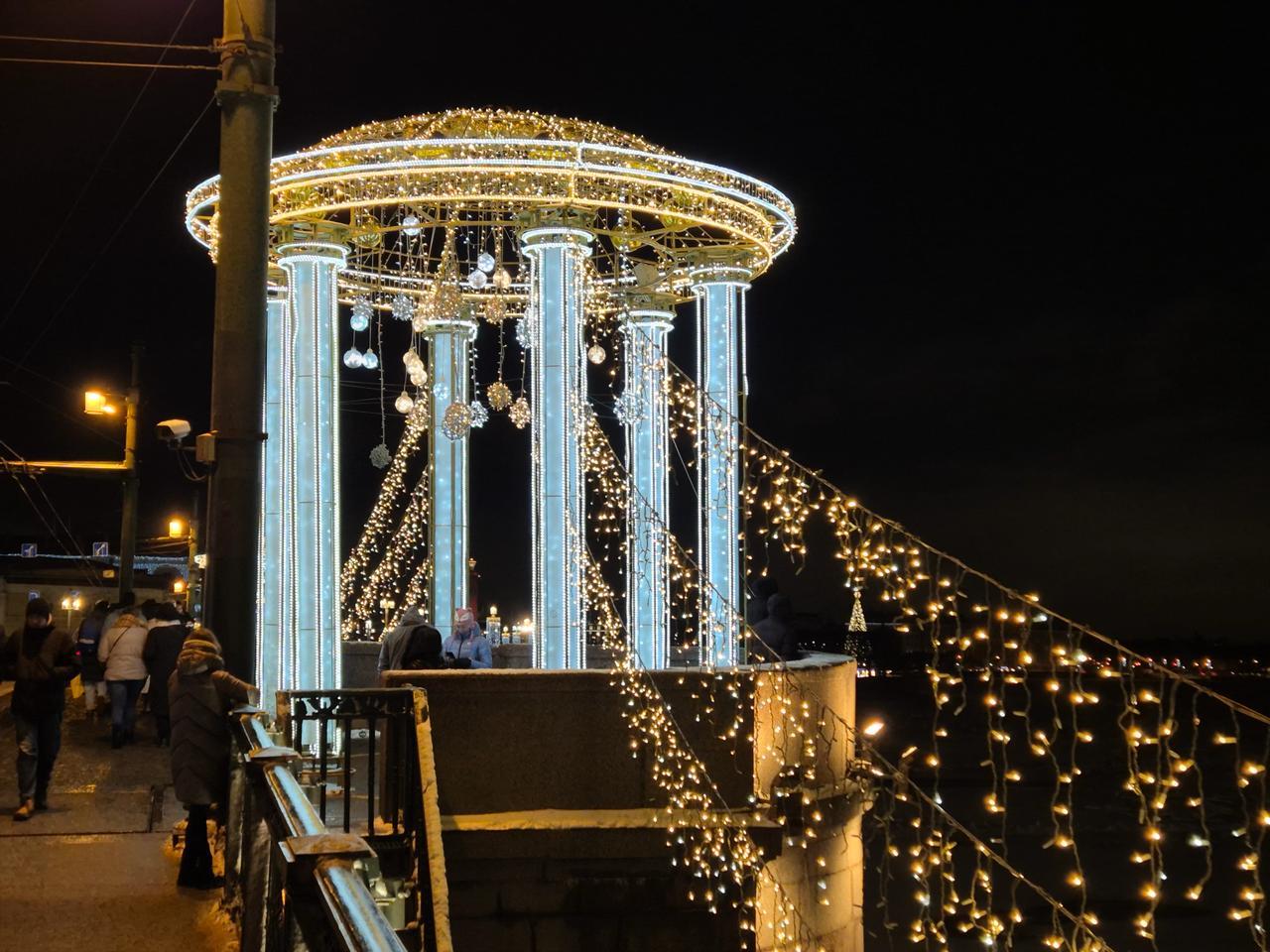 Основу оформления составляет гирлянда-бахрома тёплого белого свечения. Она размещена вдоль пролётов моста, повторяя его линии и подчеркивая архитектурный силуэт.