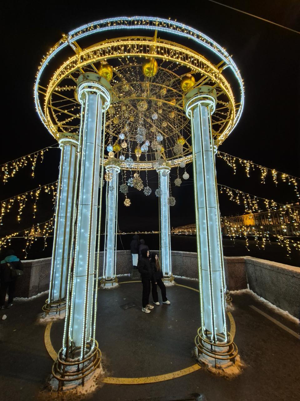 Опоры и декоративные элементы конструкции дополнены световыми фигурами. Их яркость сочетается с мягким свечением гирлянд, создавая праздничный ритм и визуальные акценты.