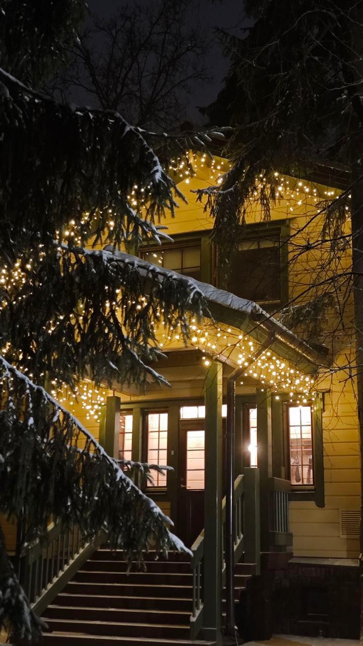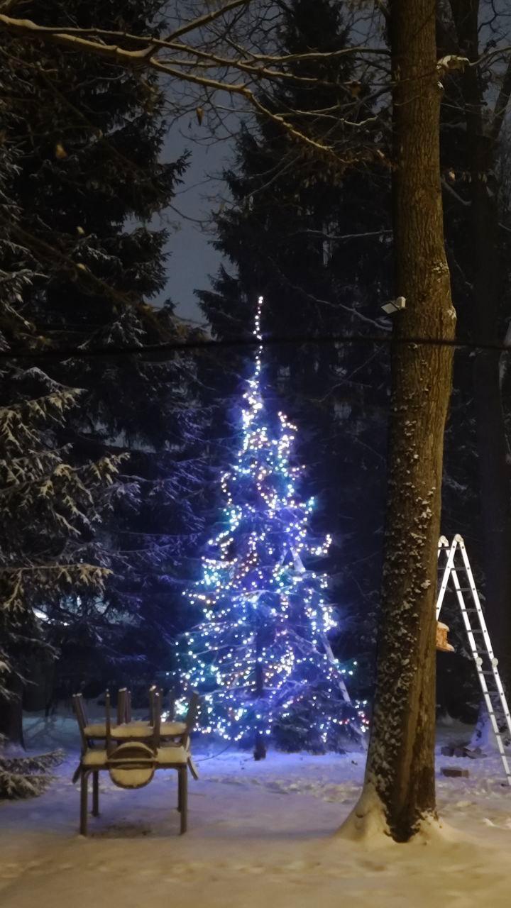 Главная идея — объединить дом и участок в единую световую композицию. Тёплая бахрома создаёт уютное «домашнее» настроение, а холодная подсветка ели добавляет зимней свежести и контраста. Всё решение выдержано в естественной палитре — без излишней яркости, с акцентом на мягкое сияние.