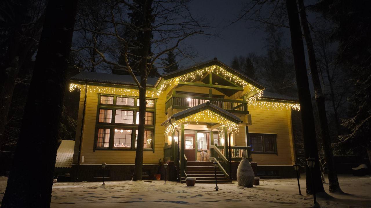 Загородный дом оформлен в уютных зимних тонах: фасад, крыльцо и беседка украшены гирляндой-бахромой с тёплым свечением, а на участке установлена подсветка живой ели холодным светом. Контраст оттенков создаёт гармоничную атмосферу праздника и подчёркивает архитектуру дома.