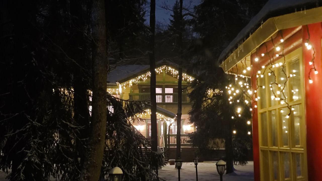 Вечером дом выглядит как из рождественской открытки — мягкое тёплое свечение фасада, мерцающая ель на фоне заснеженных деревьев. Свет подчёркивает линии кровли и архитектурные элементы, а отражения на снегу усиливают эффект уюта.