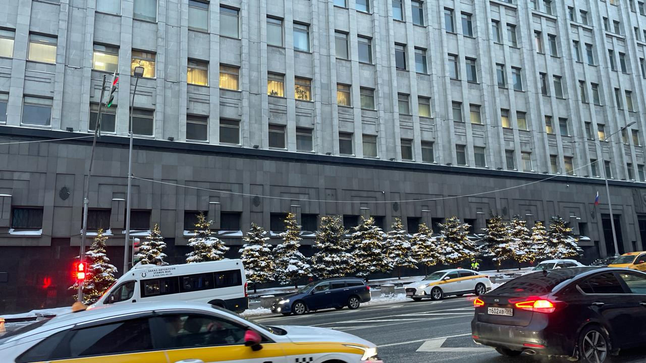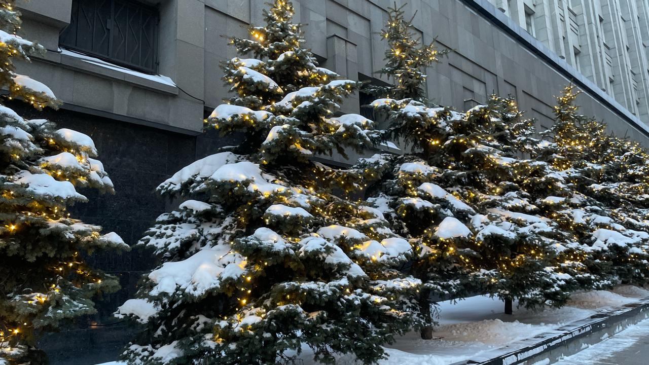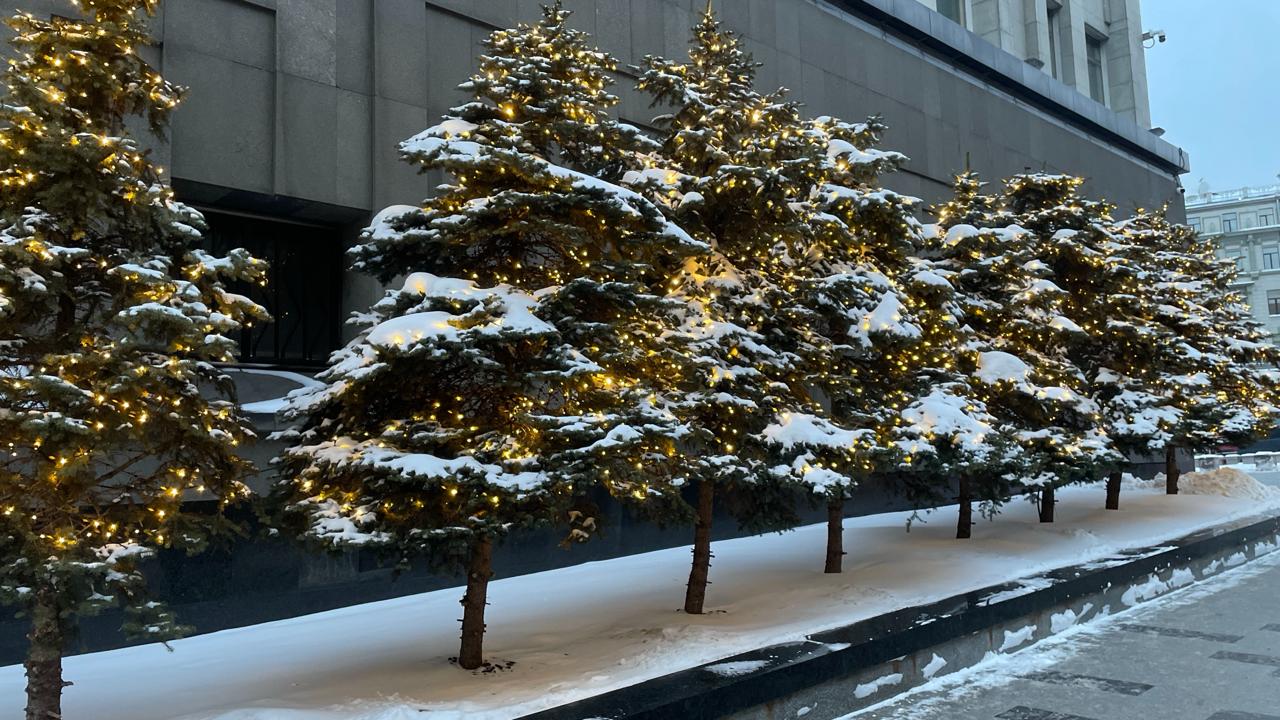 Ряд живых елей у фасада муниципального здания украшен гирляндами с тёплым белым свечением. Свет мягко подсвечивает заснеженные ветви, создавая аккуратную и торжественную атмосферу. Такое оформление подчёркивает архитектурную строгость здания и добавляет уюта городской зиме.