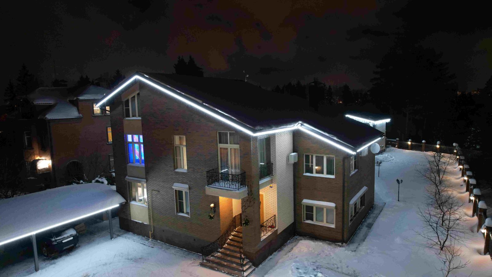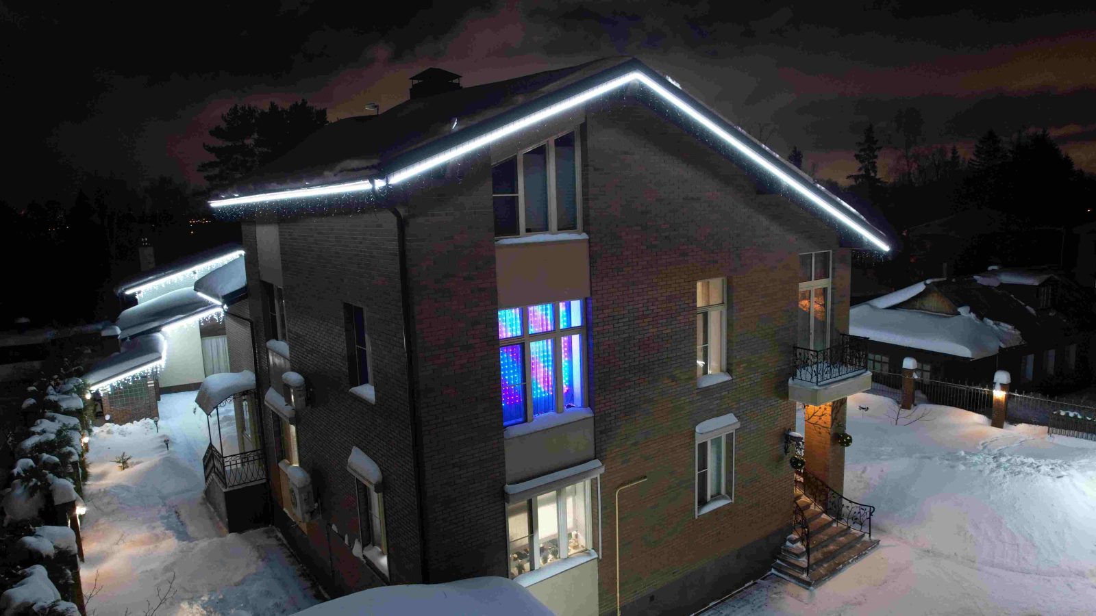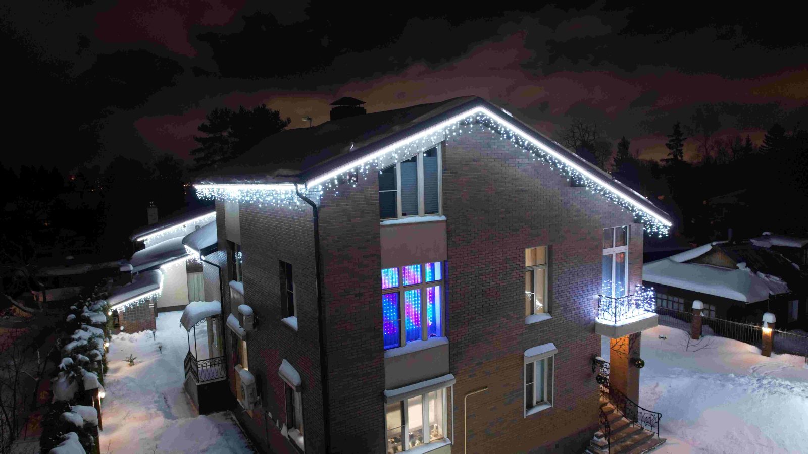 Теперь дом смотрится эффектно и издалека, и вблизи. Холодный контур подчёркивает геометрию фасада, а гирлянда «бахрома» добавляет праздничного настроения и уюта.