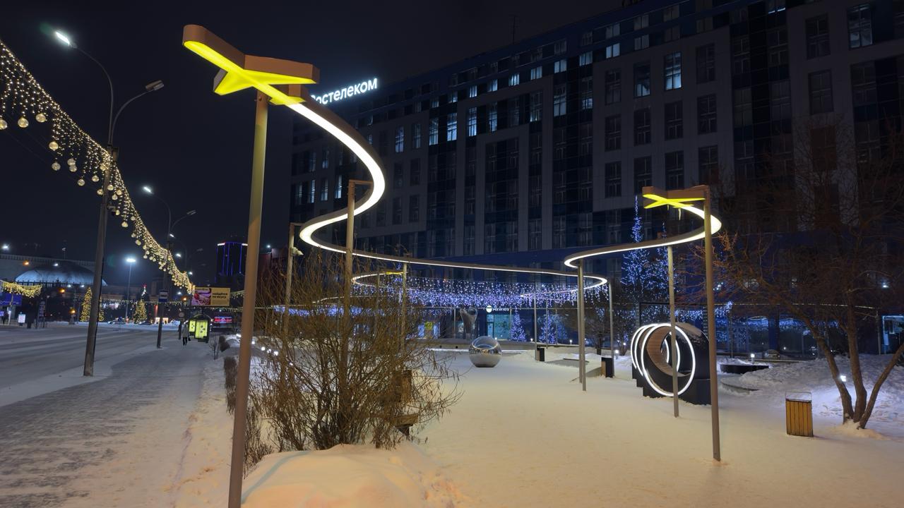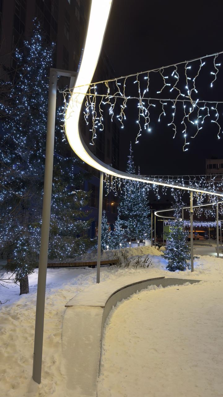 Вдоль прогулочной зоны установлены динамичные линии подсветки, создающие эффект движения и объёма. Световые дуги плавно изгибаются, переходя в декоративные конструкции с гирляндами и отражающими элементами. Пространство дополняют световые шары и заснеженные ели с холодным свечением.