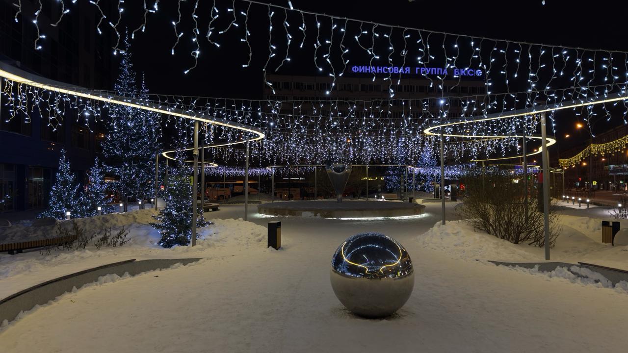 Основу композиции составляют алюминиевые опоры с интегрированными гибкими световыми элементами. Для оформления использованы гирлянды «бахрома» холодного свечения и зеркальные сферы, отражающие свет и усиливающие эффект глубины. Все конструкции выполнены с учётом уличных условий эксплуатации.