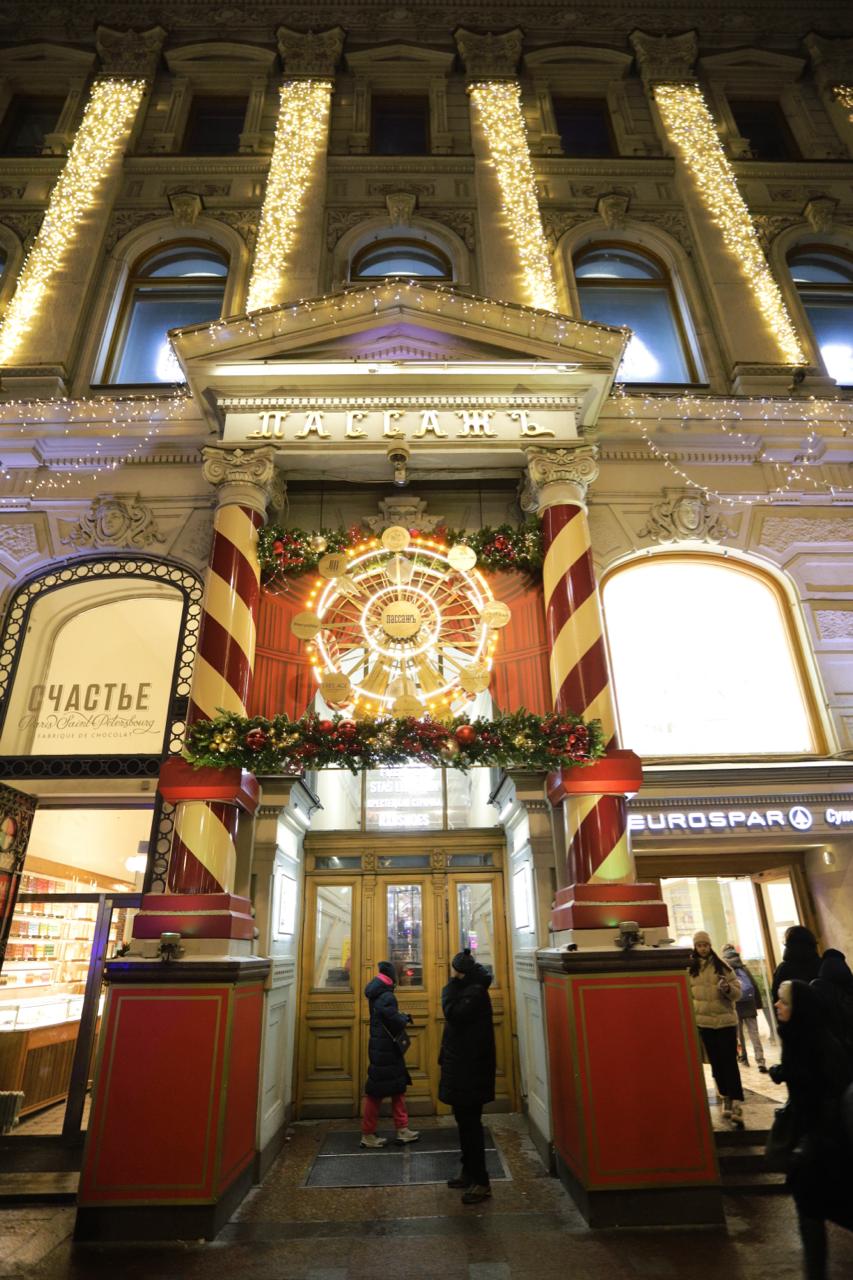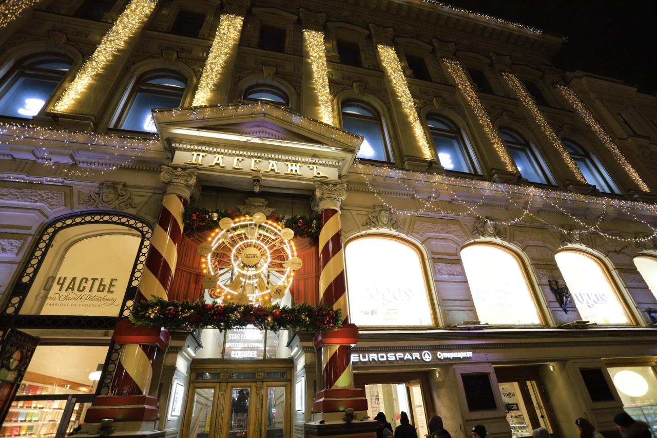 Оформление выдержано в золотисто-красной гамме с мягким светом, что создаёт классический праздничный образ. Здание выглядит нарядно и привлекательно, сохраняя при этом историческое достоинство. Вечером подсветка равномерно освещает фасад, превращая его в яркую доминанту улицы.