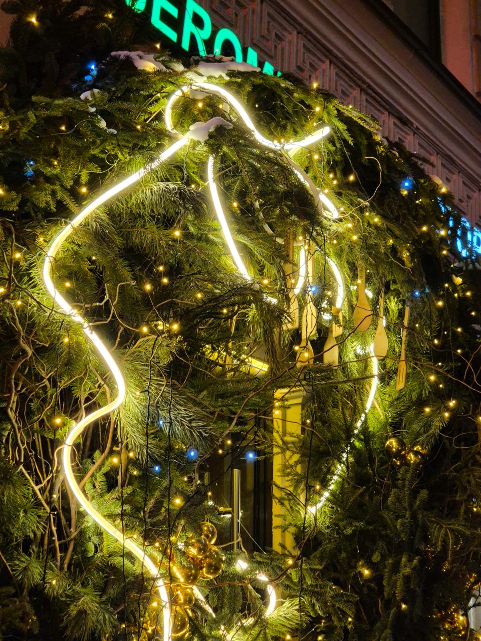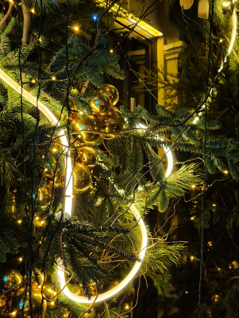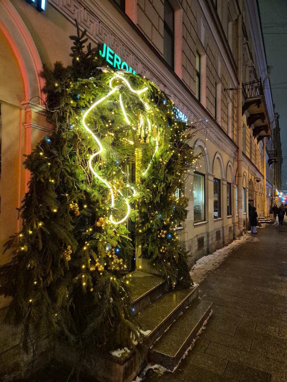 Фасад ресторана оформлен в уютной зимней стилистике. Входная группа украшена натуральными еловыми ветвями, гирляндами тёплого свечения и неоновой лентой, создающей мягкое контурное свечение. Золотые шары и декоративные элементы добавляют блеска, а жёлтый неон формирует выразительный визуальный акцент на фоне архитектуры здания.
