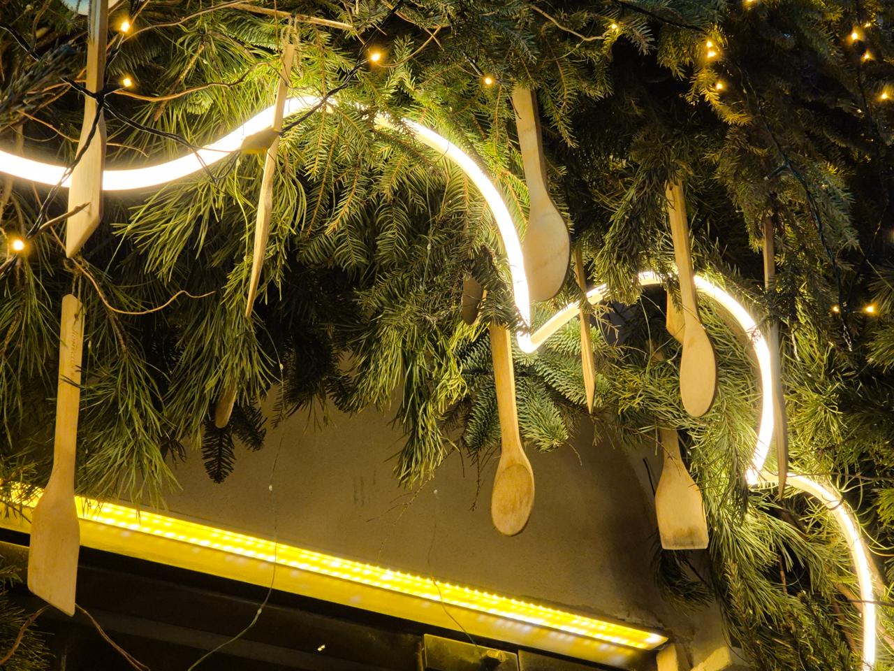 Основная идея — создать атмосферу уюта и гостеприимства. Светлая подсветка и зелёные еловые ветви подчёркивают праздничное настроение, а неоновая линия добавляет современный штрих в классическое оформление.