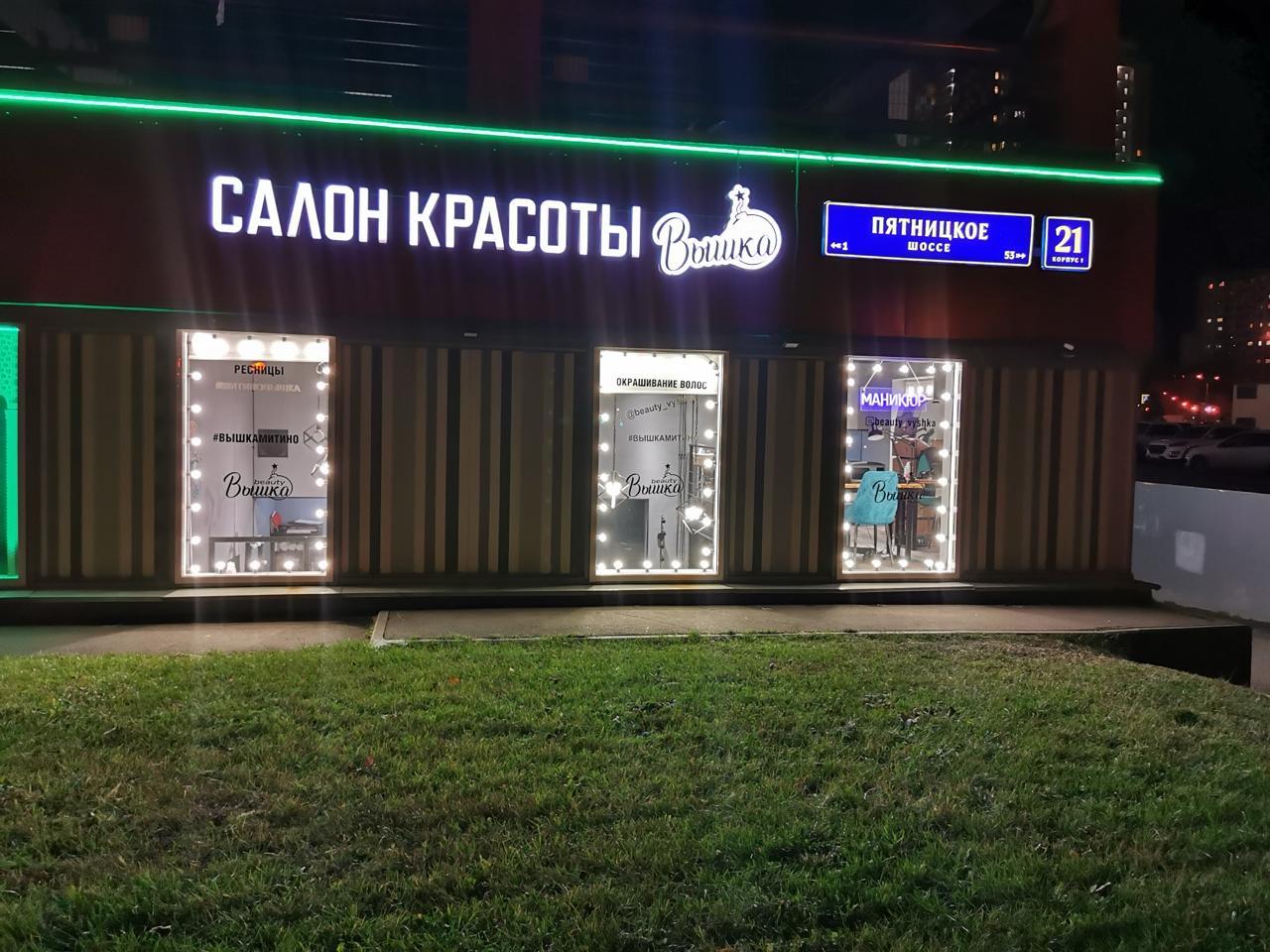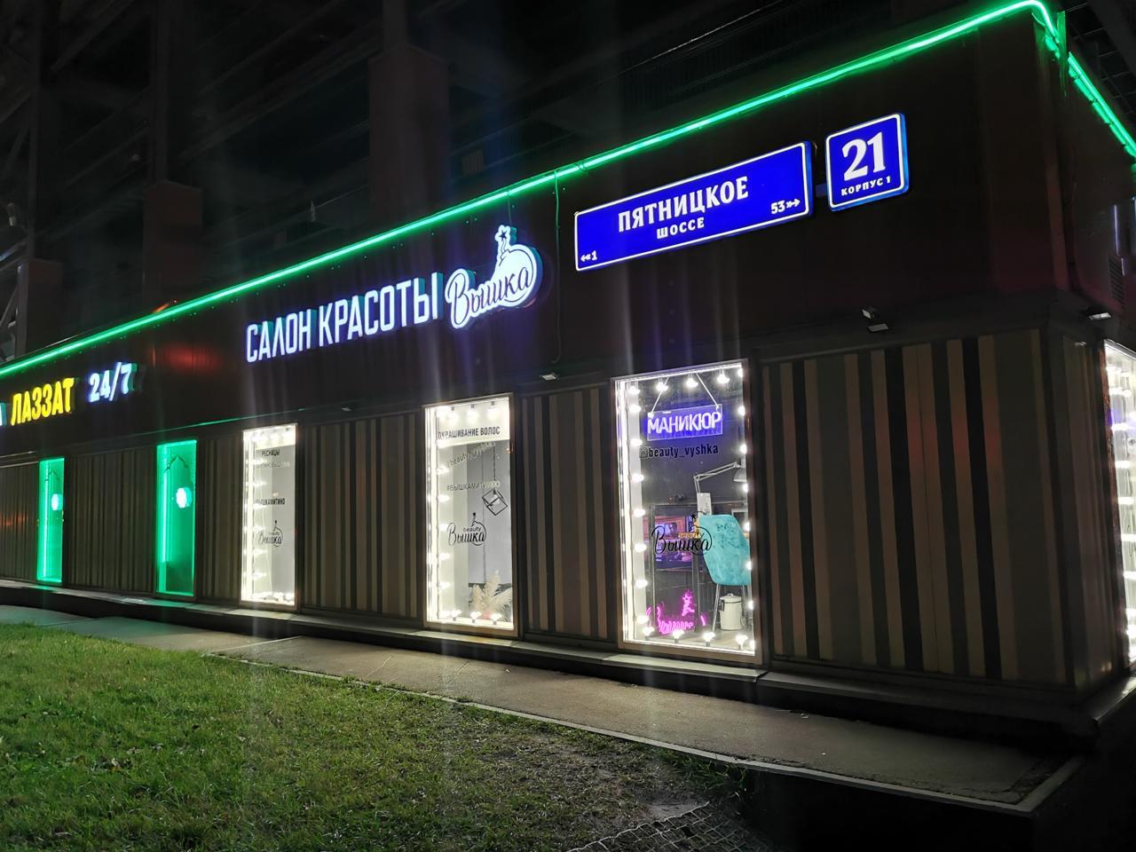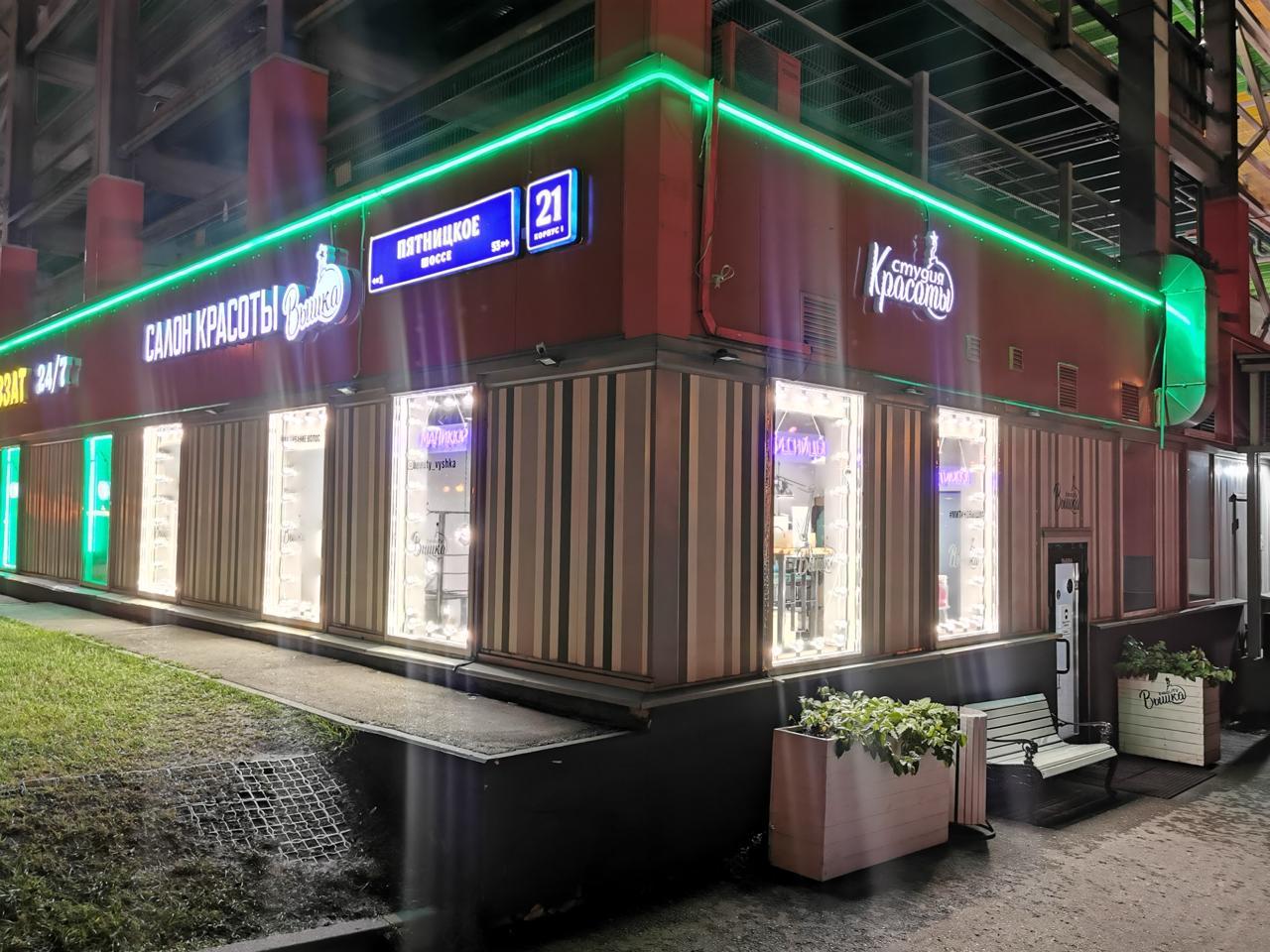 Для салона красоты в Москве мы разработали решение, которое выделяет здание в вечернее время. По контуру фасада установлен зелёный гибкий неон, а витрины обрамлены гирляндой белт-лайт в тёплом белом свете.