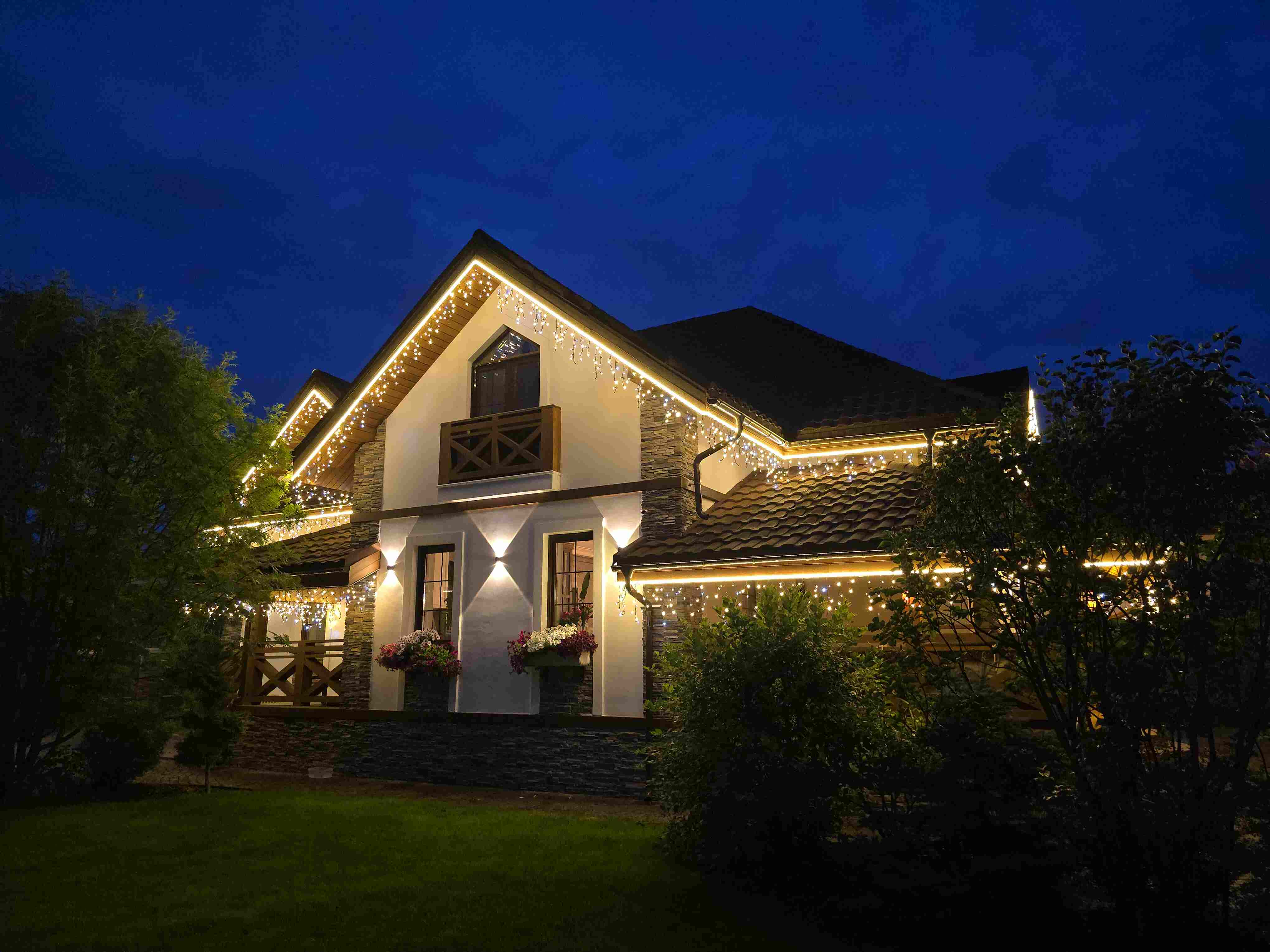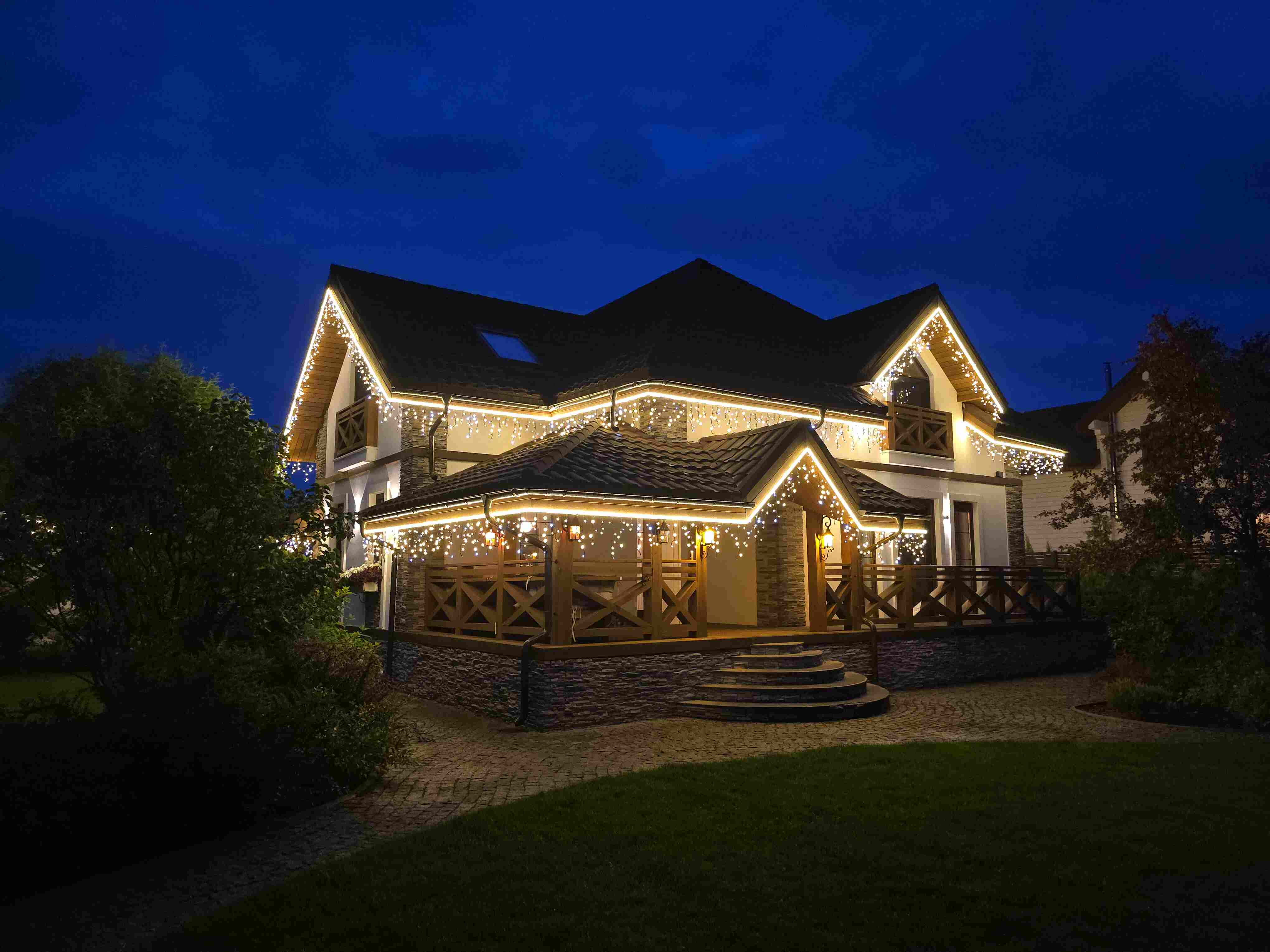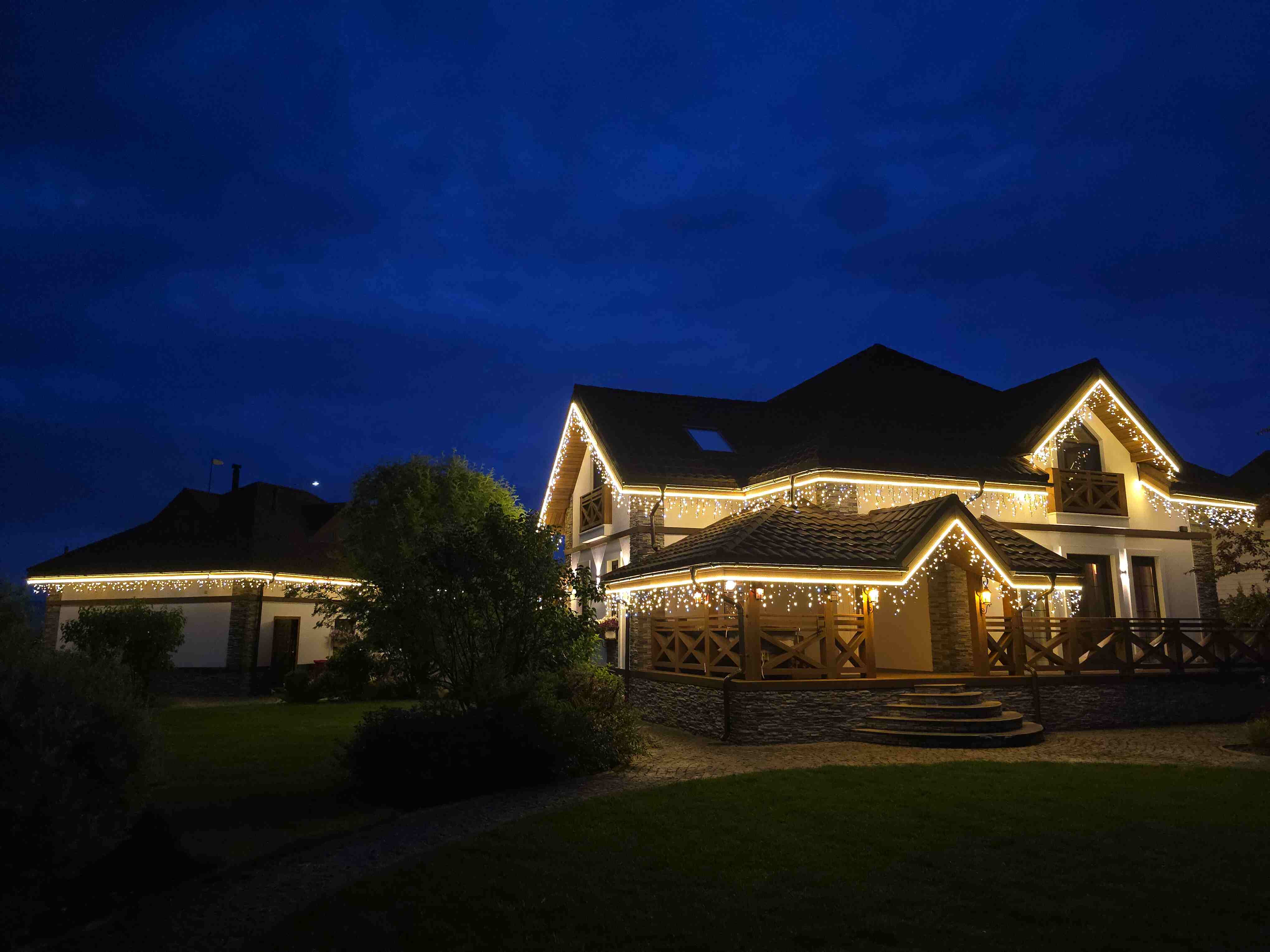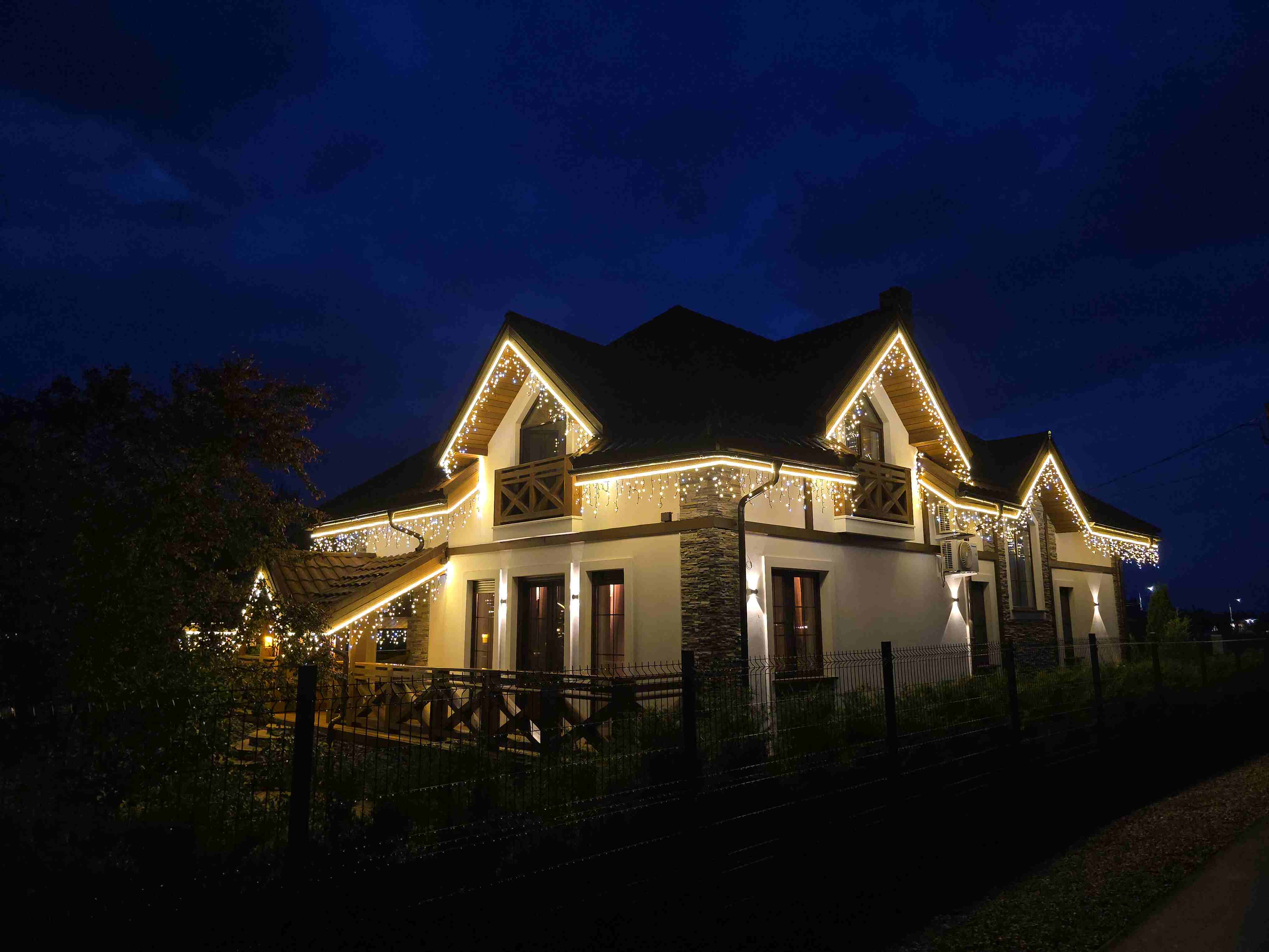 Клиент обратился к нам по рекомендации знакомого. Нам прислали референсы и фото дома. На месте мы сделали замер, оценили архитектуру и сняли фасады. Сразу заметили важную деталь: ранее владелец сам повесил белую бахрому. На тёмном фасаде она слишком выделялась и «шумела» в кадре, из-за чего общий вид терял аккуратность.
