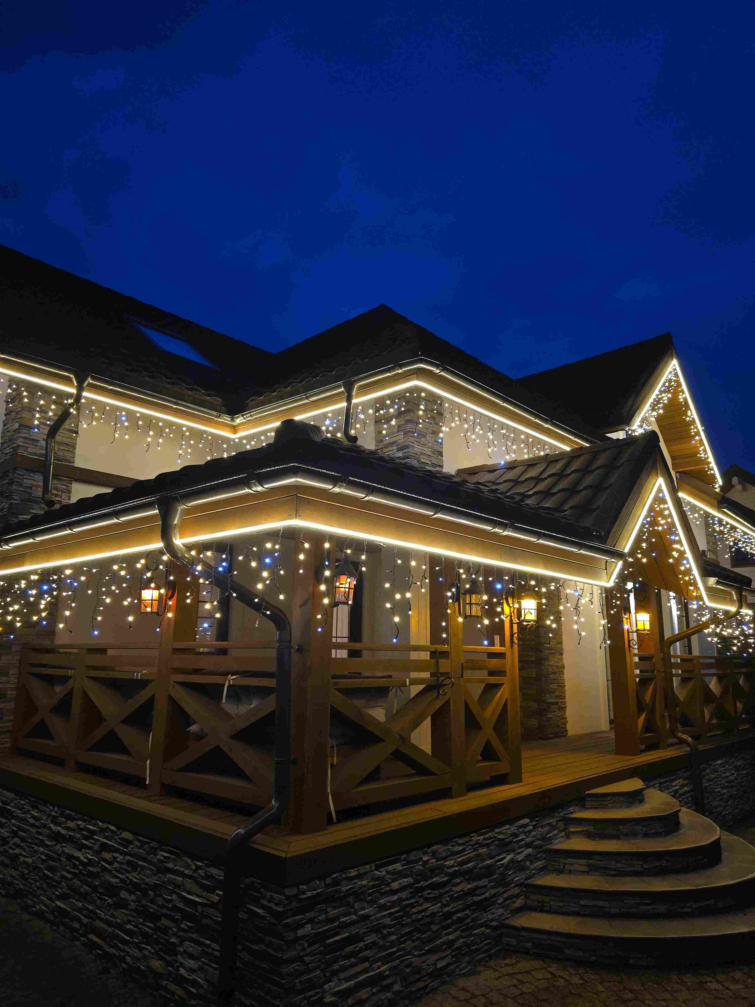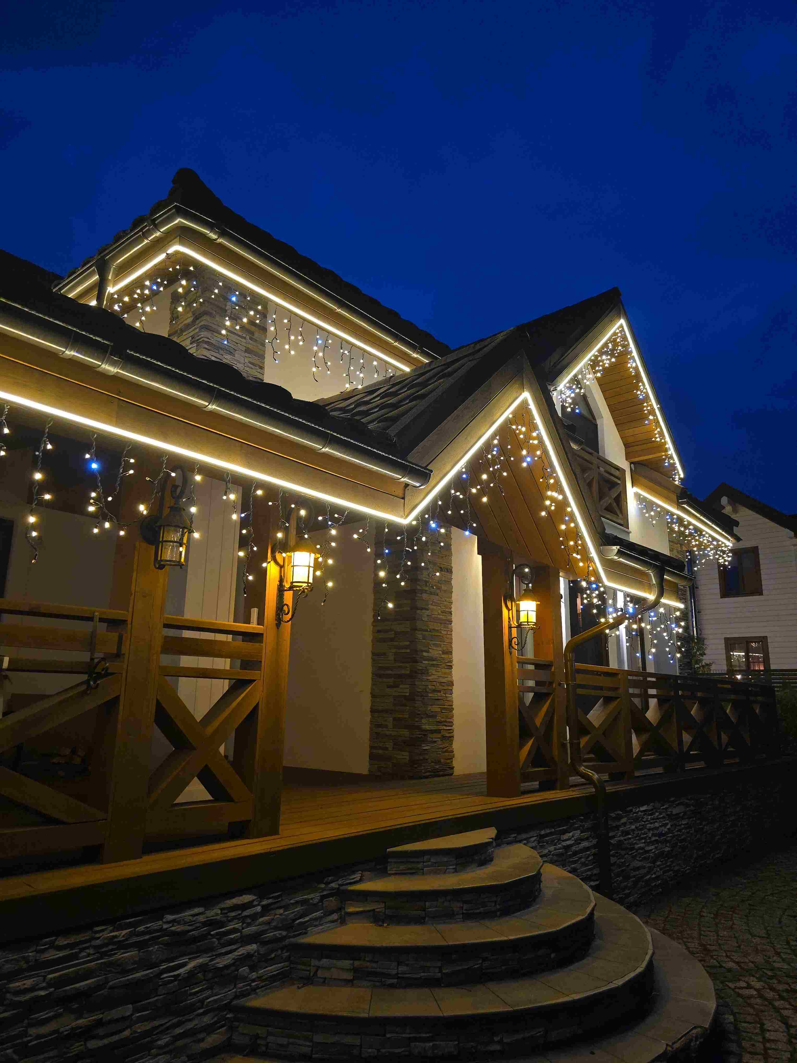Мы подготовили визуализацию для всех ключевых зон: основной дом, включая террасу и крыльцо, баня, гостевой дом и беседка. Отправили коммерческое предложение с двумя пакетами — стандарт и премиум. Клиент выбрал премиум, в котором мы предложили заменить белую бахрому на чёрную для аккуратной интеграции с тёмным фасадом и добавить контур из гибкого неона, чтобы подчеркнуть архитектурные линии и получить цельный «вечерний» образ.